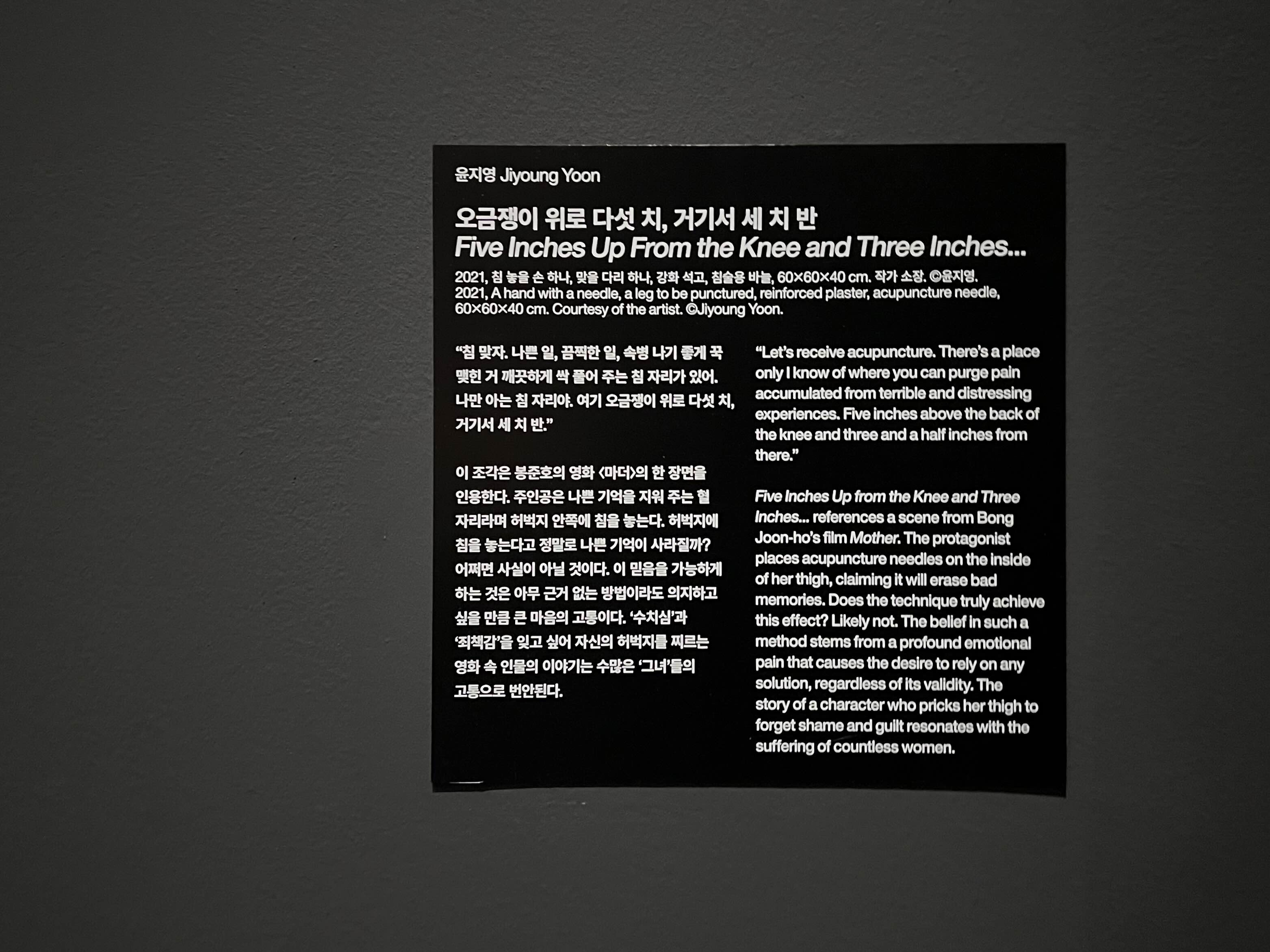 이 조각은 봉준호의 영화 <마더>의 한 장면을 인용한다. 주인공은 나쁜 기억을 지워 주는 혈 자리라며 허벅지 안쪽에 침을 놓는다. 허벅지에 침을 놓는다고 정말로 나쁜 기억이 사라질까?