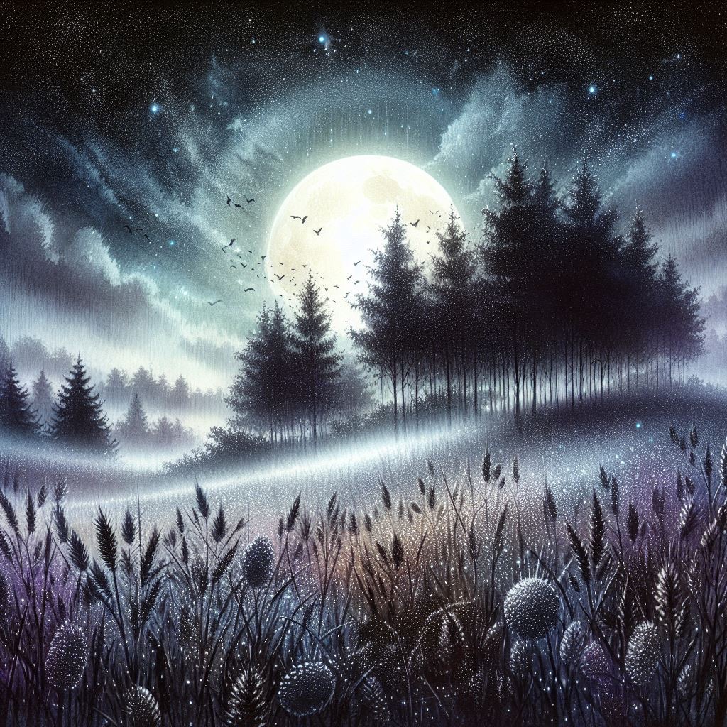 Midnight, a meadow covered in dew and mist, tree silhouettes in the backdrop, by C_F. Moonlight, romantic atmosphere, magic of nature, highly detailed drawing using pen and ink, liquid ink, soft colours, strong interplay of light and shadow.