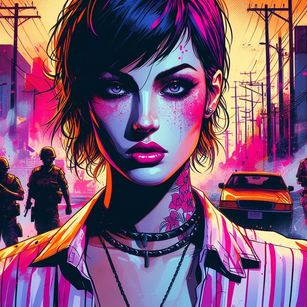 photograph by [Brooke Shaden | Tomer Hanuka] in the style of GTA5-style Illustration Digital Art by Tomer Hanuka, vibrant colors, graphic novel style, dynamic compositions, emotional storytelling, bold lines,