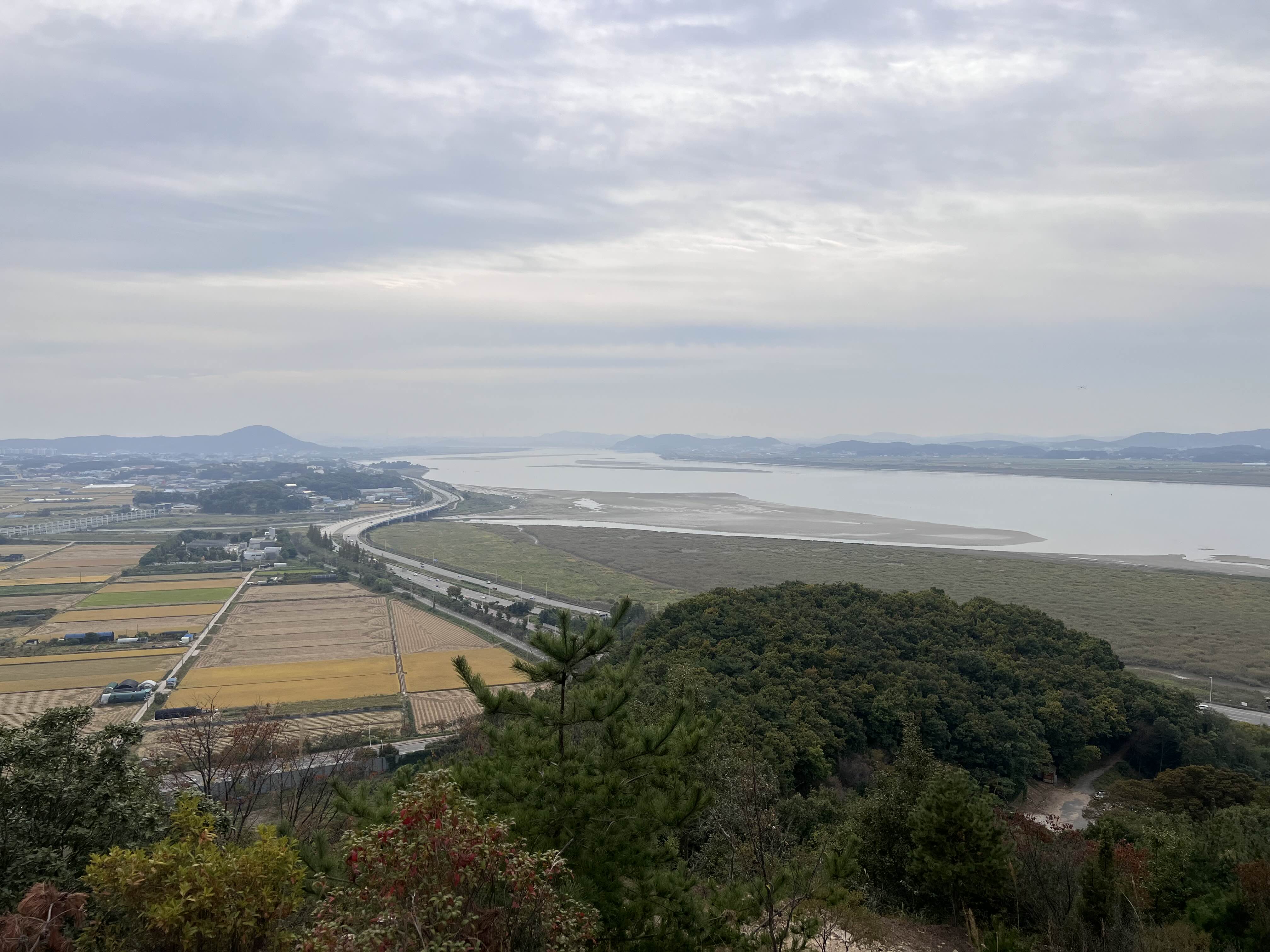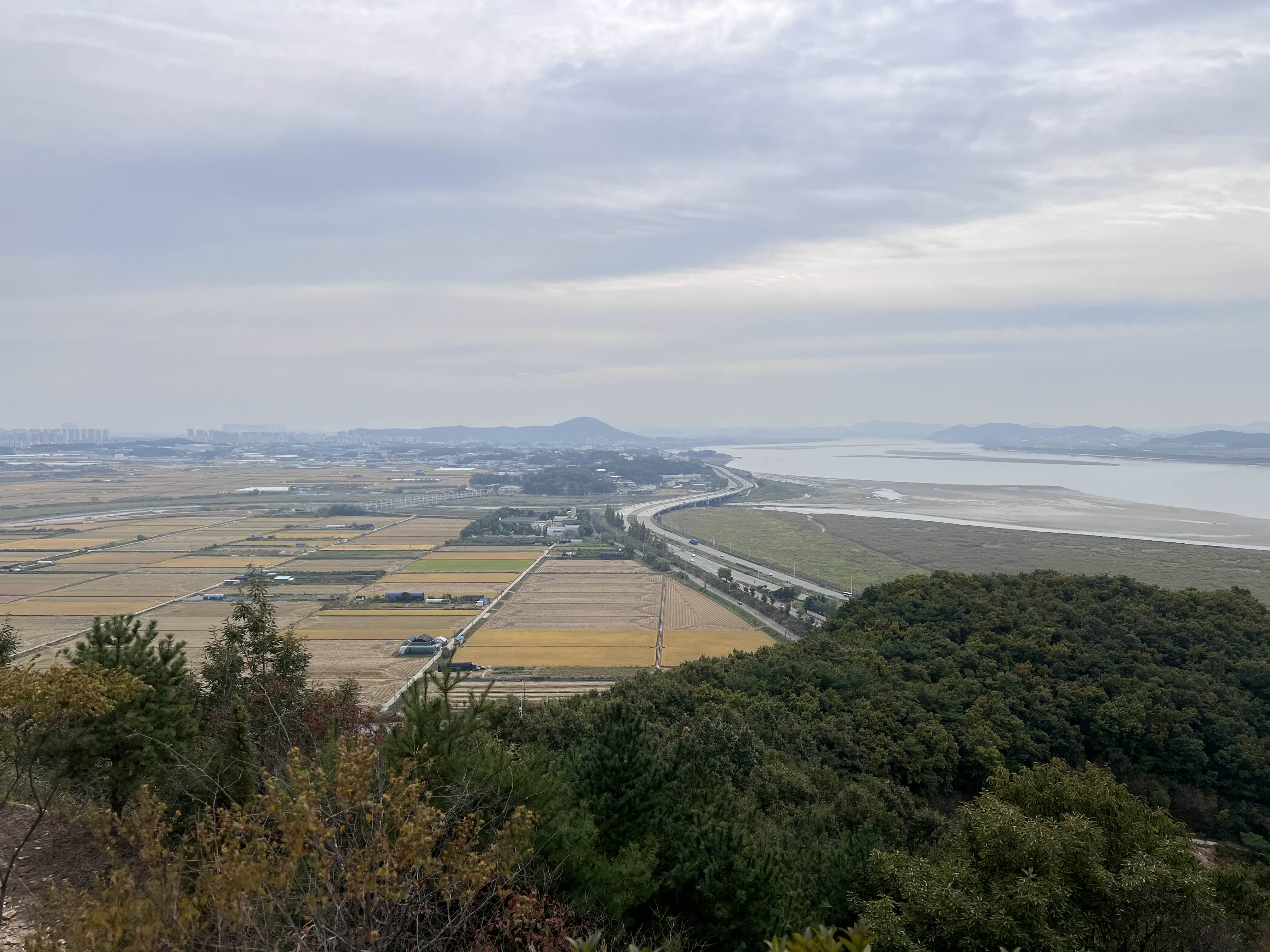 정상으로 오르면서 잠시 넙적한 돌에 앉아 강과 누렇게 익어가는 벼, 서울로 뻗어있는 자유로를 바라보며 삼국시대 이곳은 서로 뺏고 뺏기는 격전지 였다고 선배에게 전해들었다, 전망 좋은곳이다.