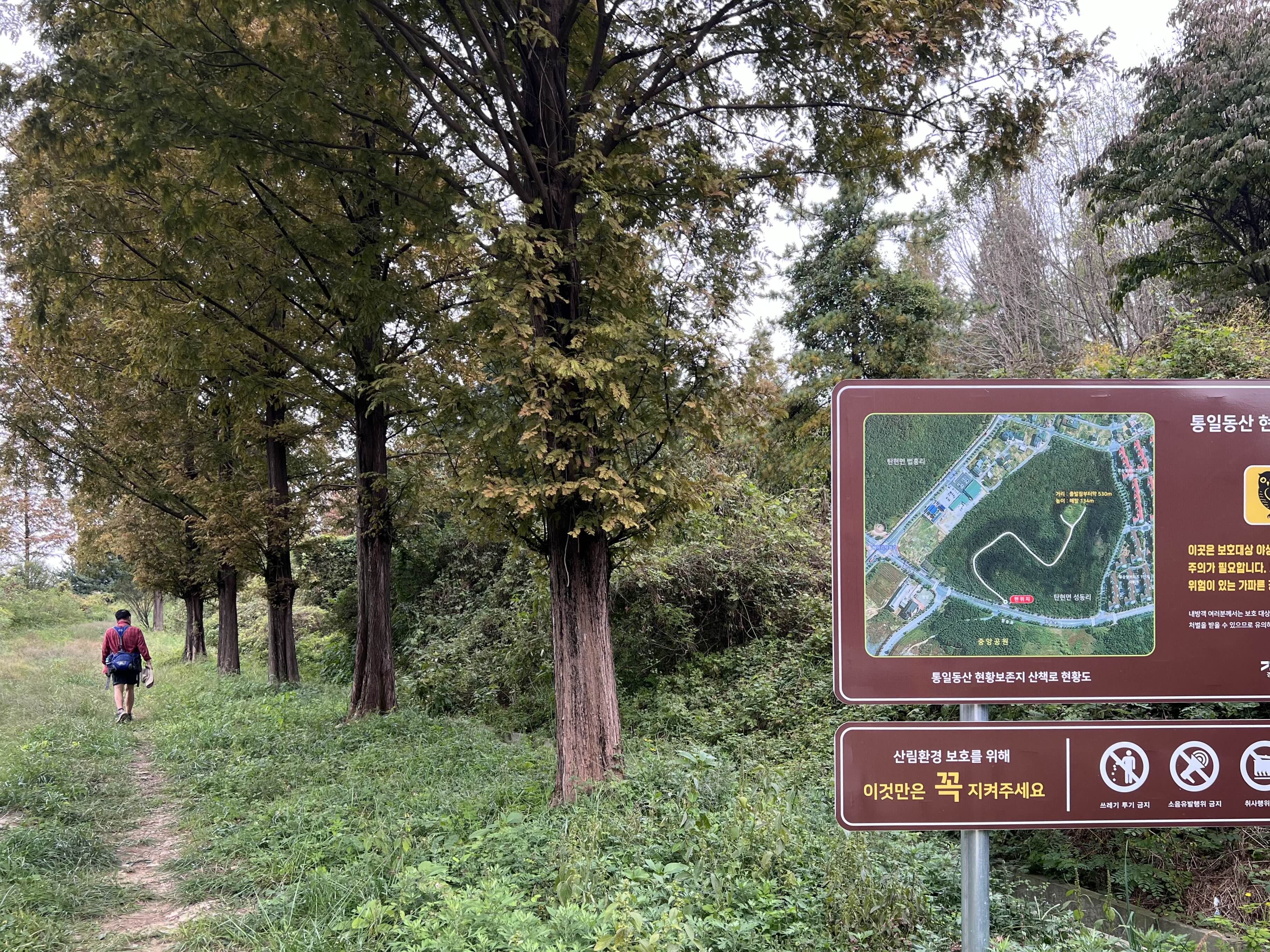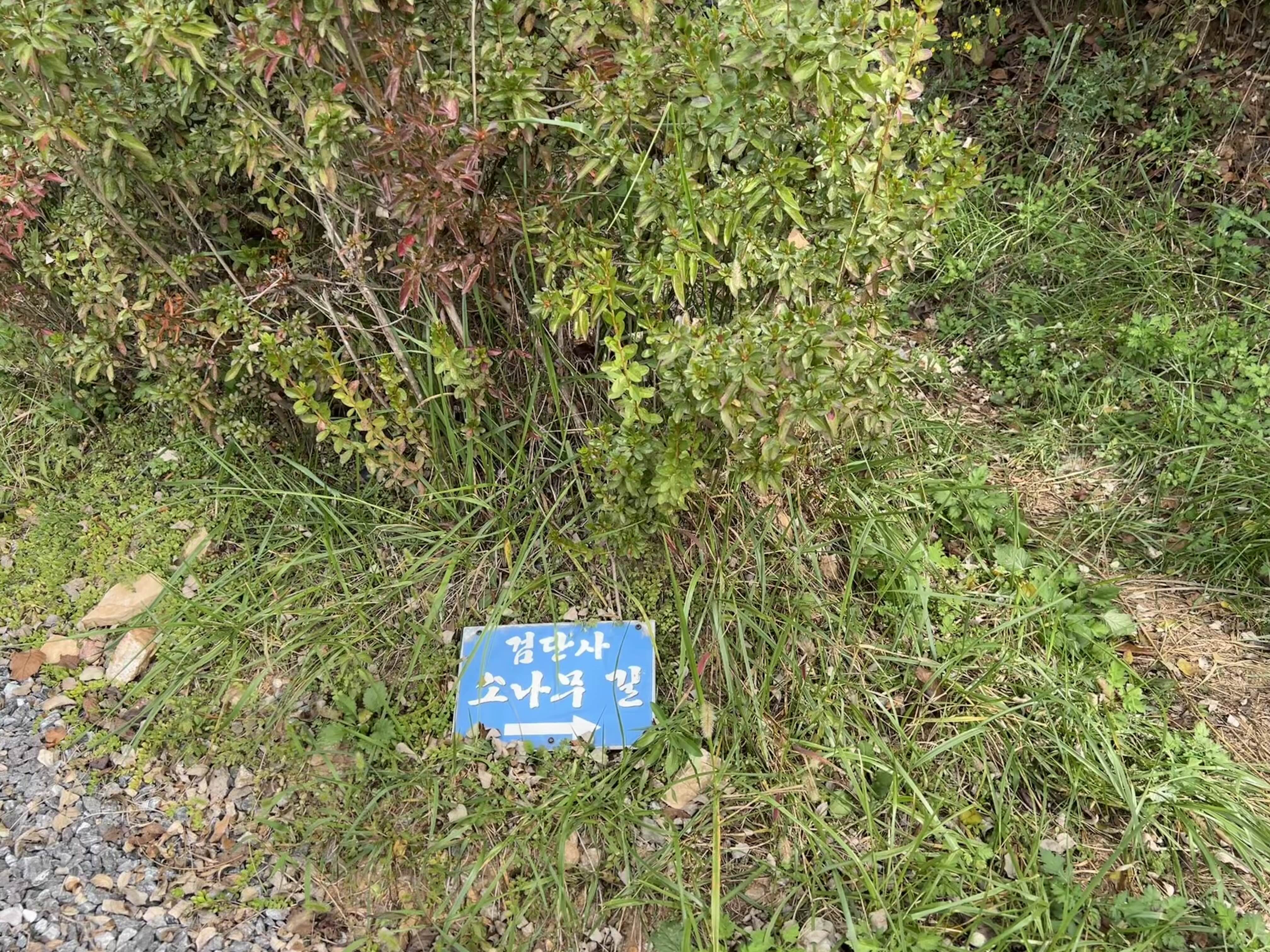 절 뒤편 땅바닥에 눕혀있는 소박해 보이는 나무판자 에 적힌 소나무길 안내 옆 오솔길로 오른다.