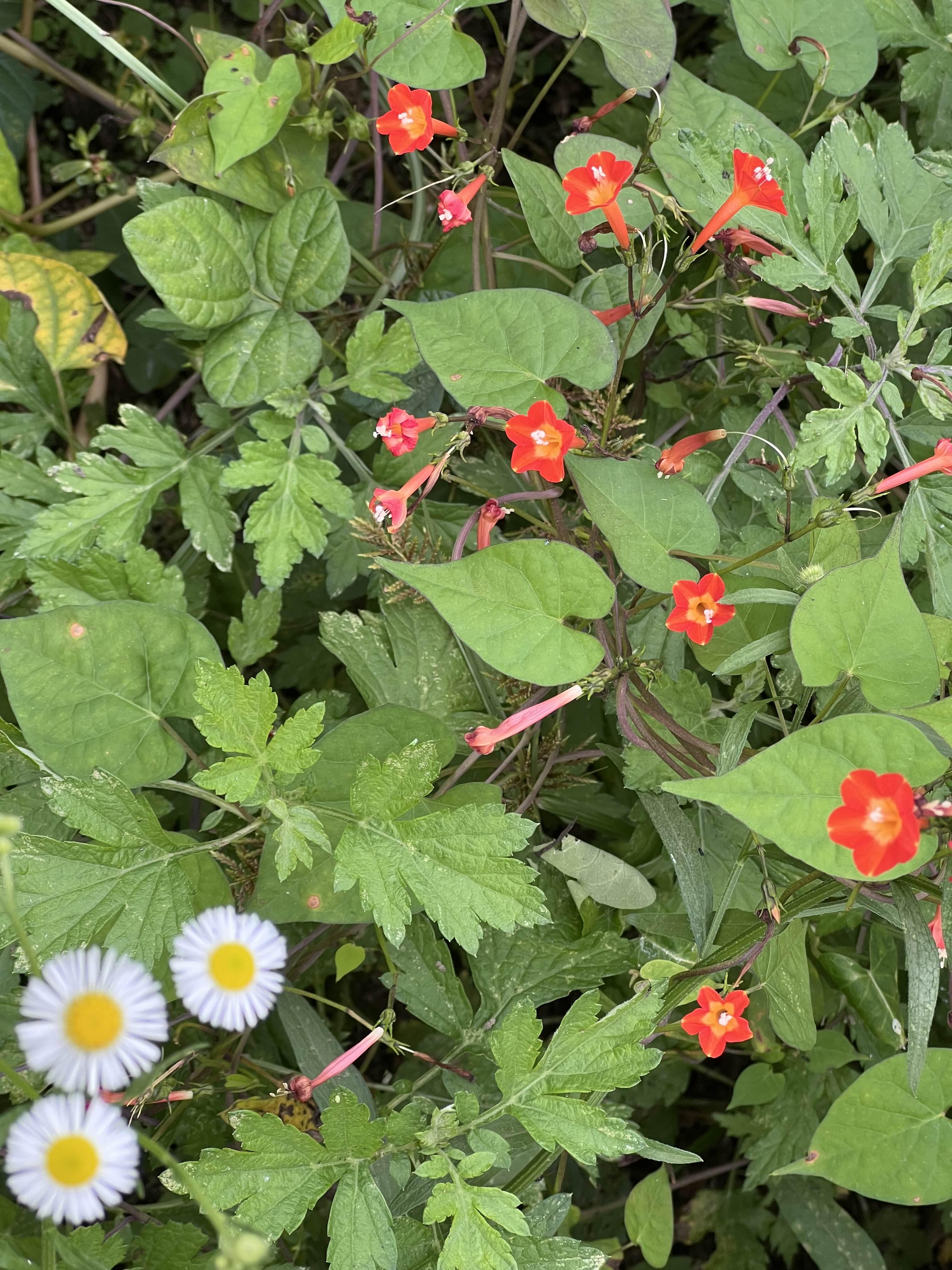 유홍초와 비슷하지만 잎이 갈라지지 않기 때문에 둥근잎유홍초라고 한다. 작은 하얀 국화꽃모양 3개의 데이지 와 주황빛 둥근잎 유홍초의 자연스럽게 어울려 있다.