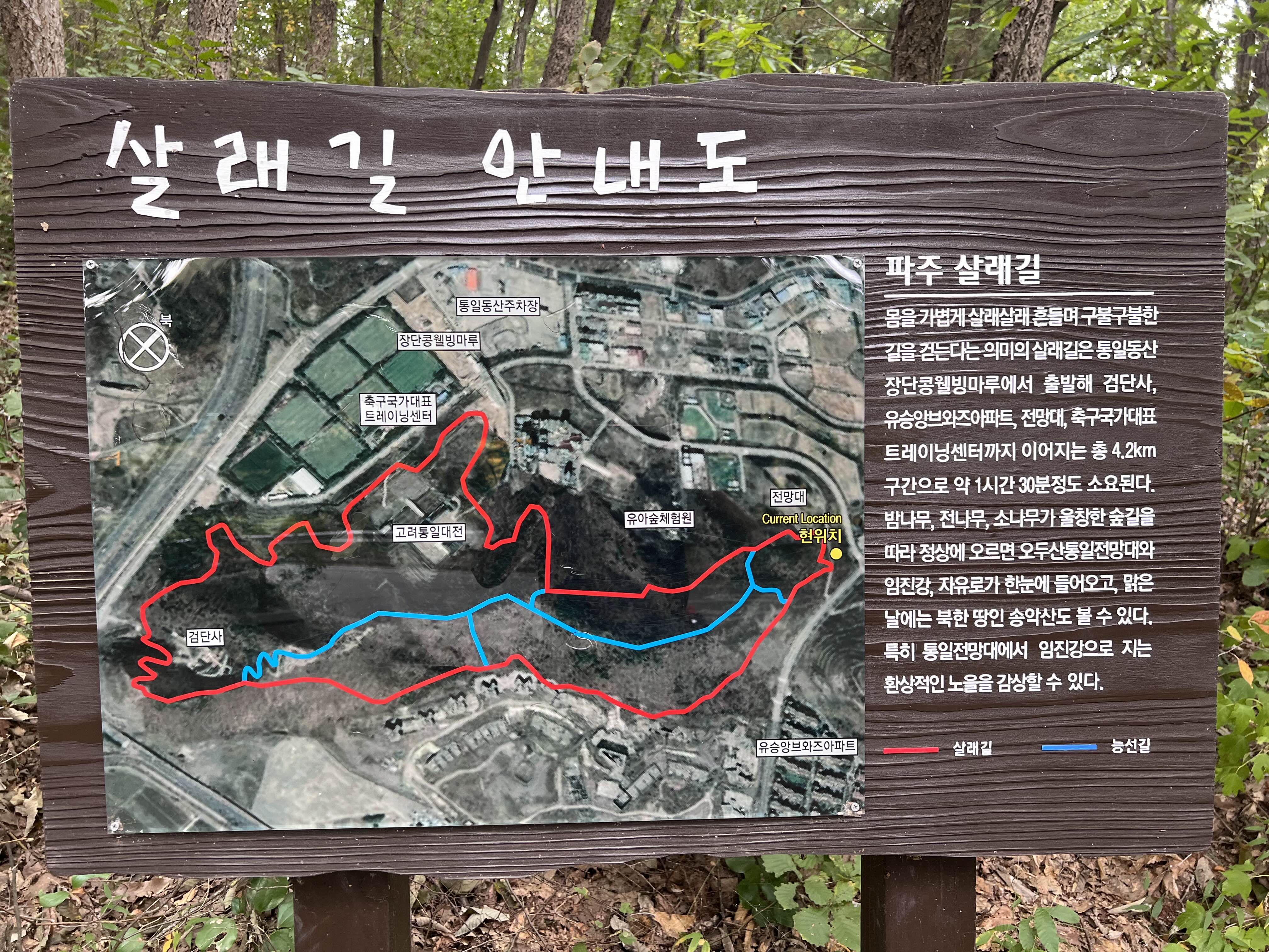 파주 살래길 몸을 가볍게 살래살래 흔들며 구불구불한 길을 걷는다는 의미의 살래길은 통일동산 장단콩웰빙마루에서 출발해 검단사, 유승앙브와즈아파트, 전망대, 축구국가대표 트레이닝센터까지 이어지는 총 4.2km