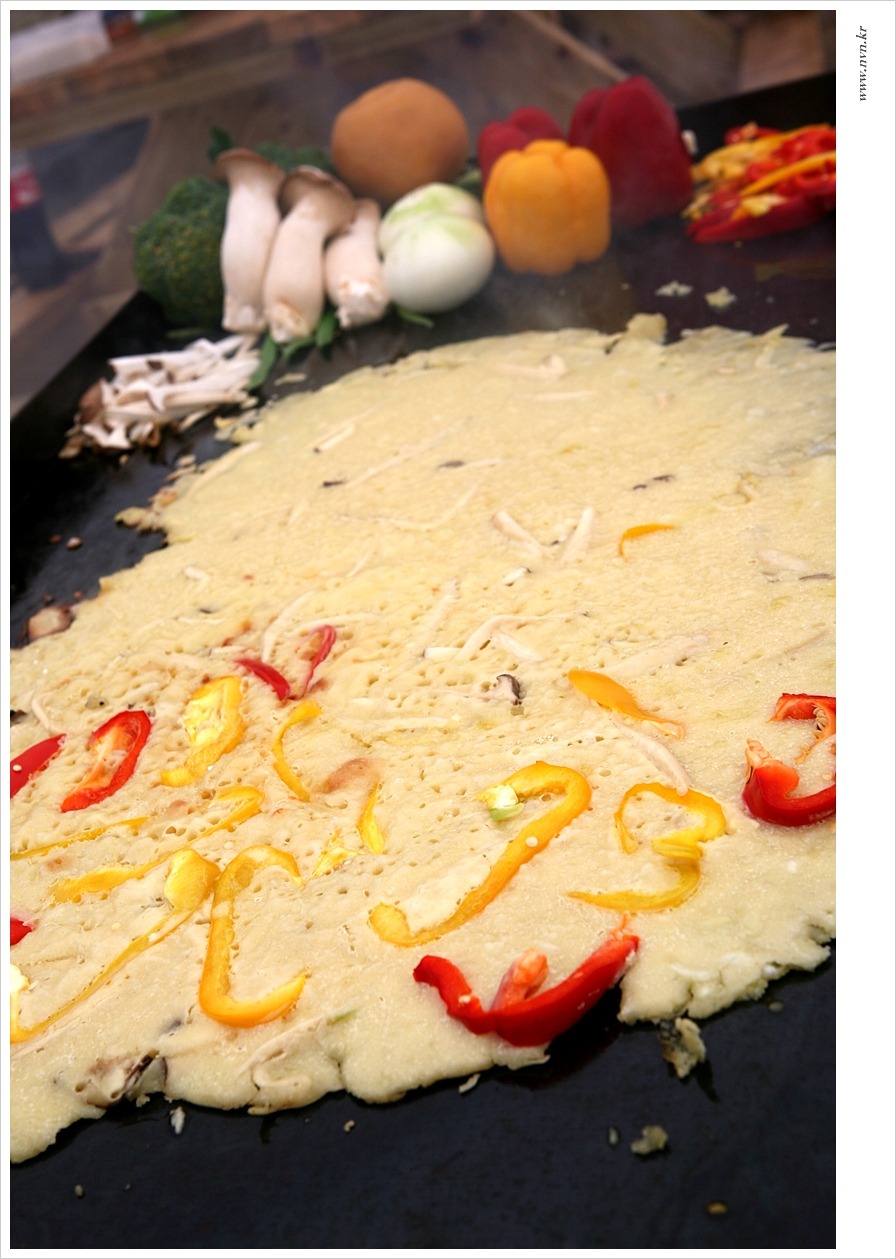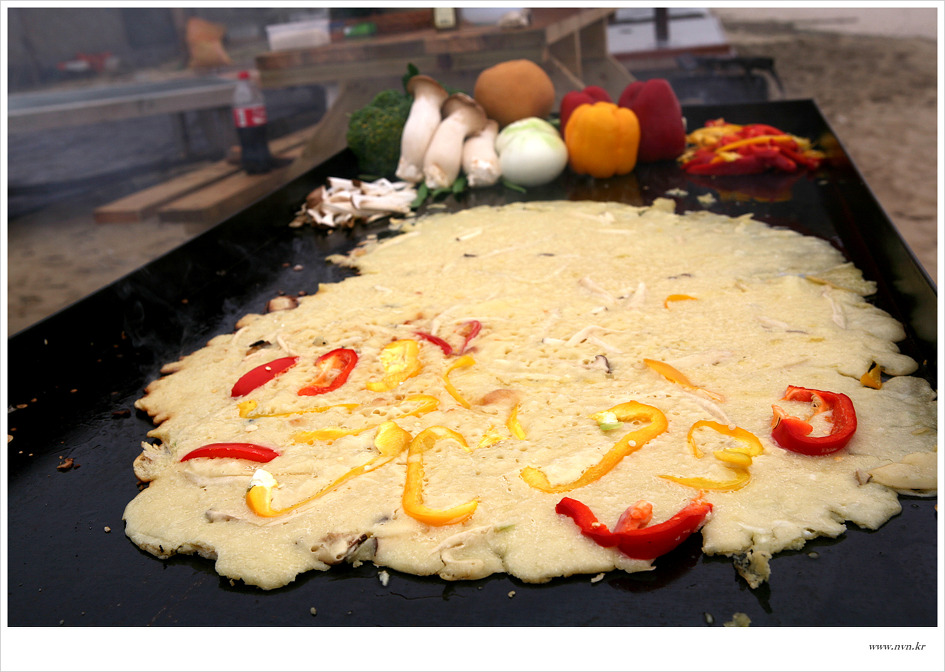 안개 낀 바닷가 해수욕장에 파도치는 소리와 철판에 굽는 소리 맛있는 냄새와 바다 내음의 분위기에서 먹는 파전의 맛은 독특하다, 파전 사이사이 야채와 곁들여 먹으면 더욱 맛이 오묘합니다.