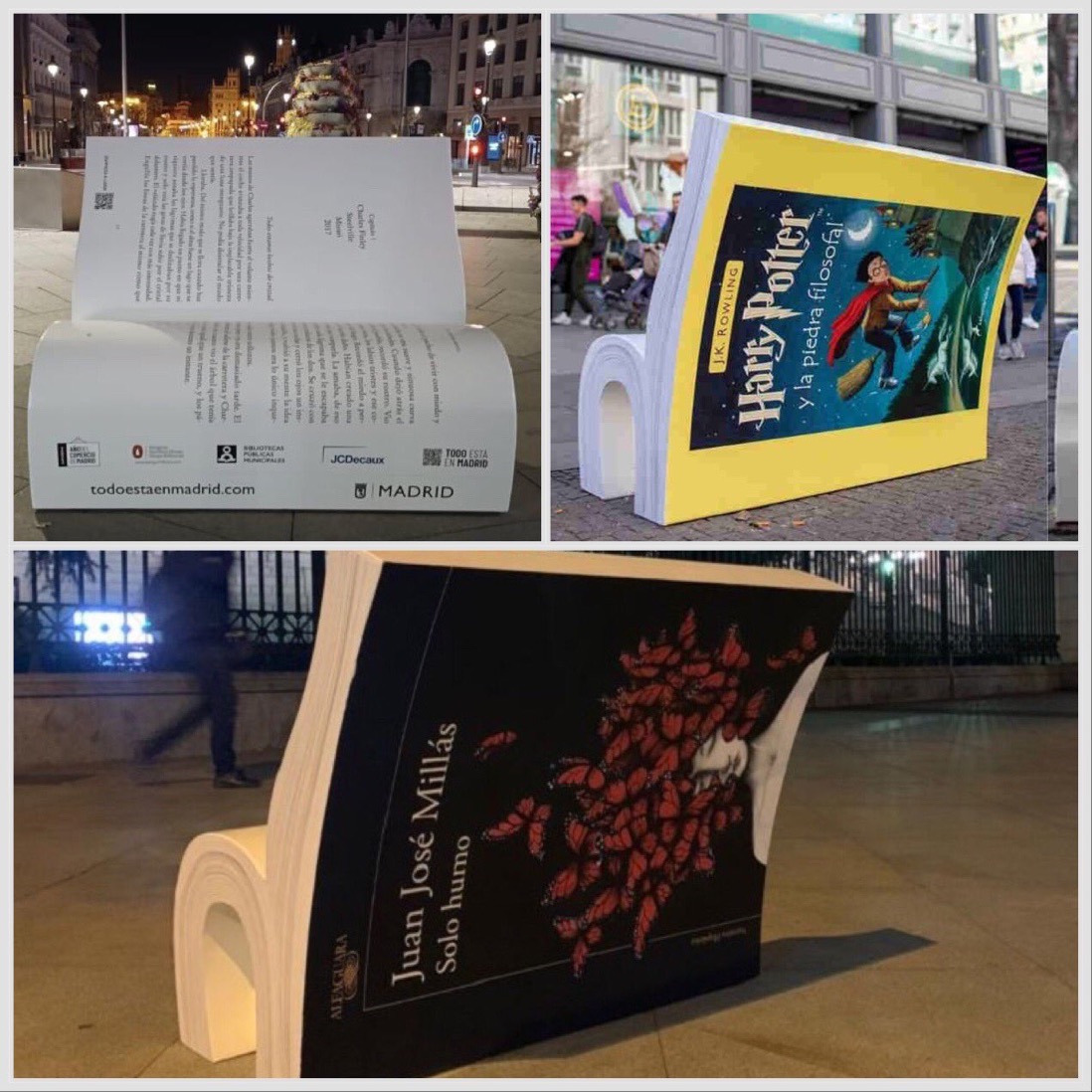 “Nelle strade di Madrid sono apparse delle strepitose sculture. Sono delle panchine a forma di libro per avvicinare i cittadini alla lettura in tutti i suoi format, specialmente su carta e avvicinare i passanti ai libri.”