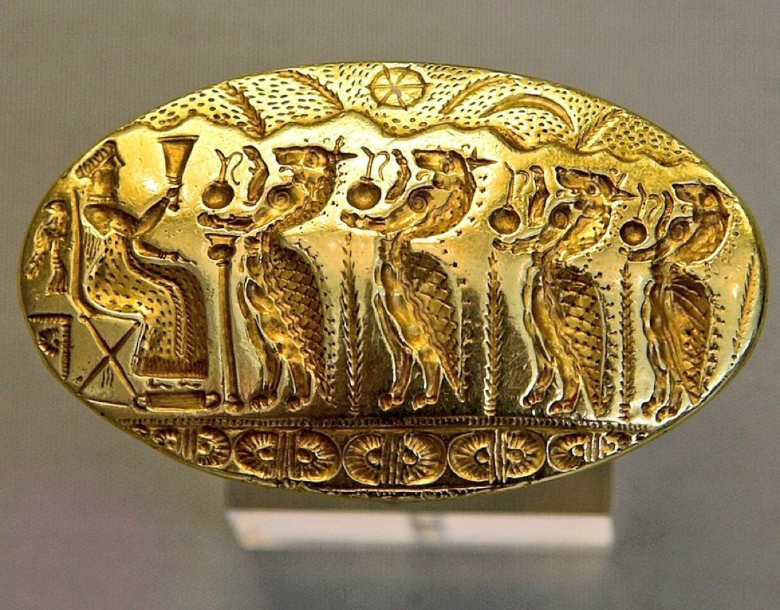 #Gold 앉아 있는 반지 #Goddess 와 제물을 품은 미노아 천재 인물의 행, 미케네 #Greece 의 문맥에서 발견되지만 아마도 미노아 크레타에서 만들어졌을 것입니다.