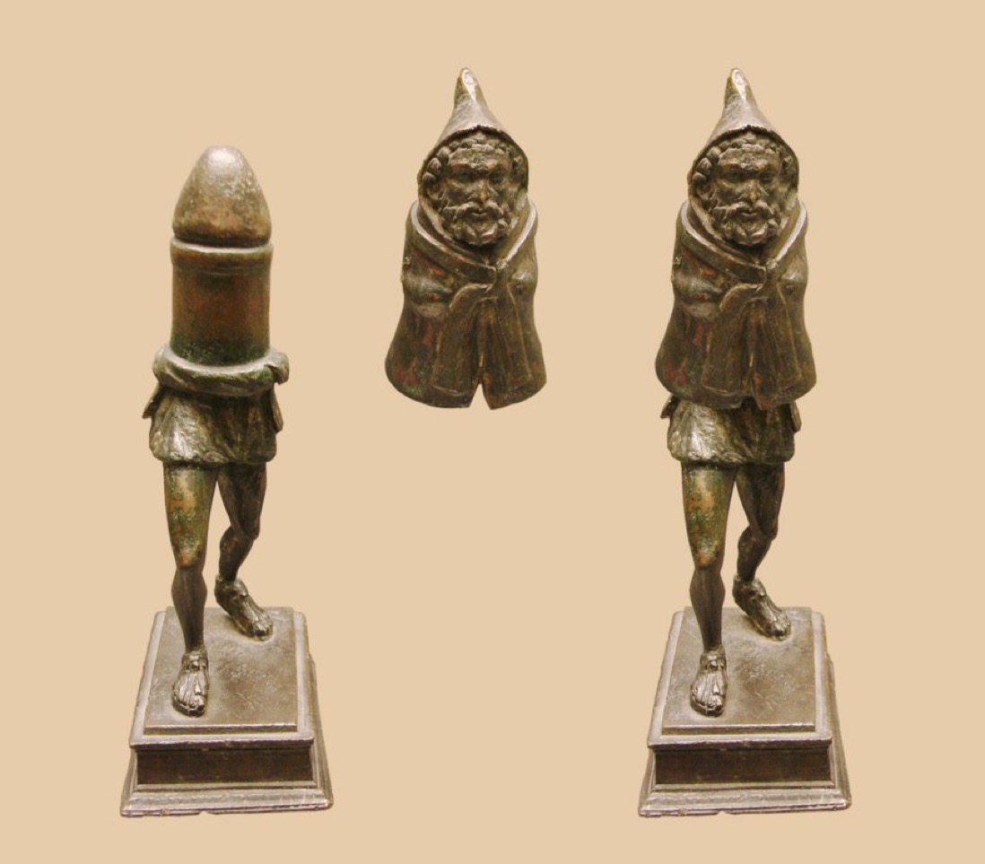 데이트 c. 1세기 CE, 그는 그 아래에 남근을 숨기는 쿠쿨루스(두건이 있는 갈리아 코트)를 입고 있습니다.