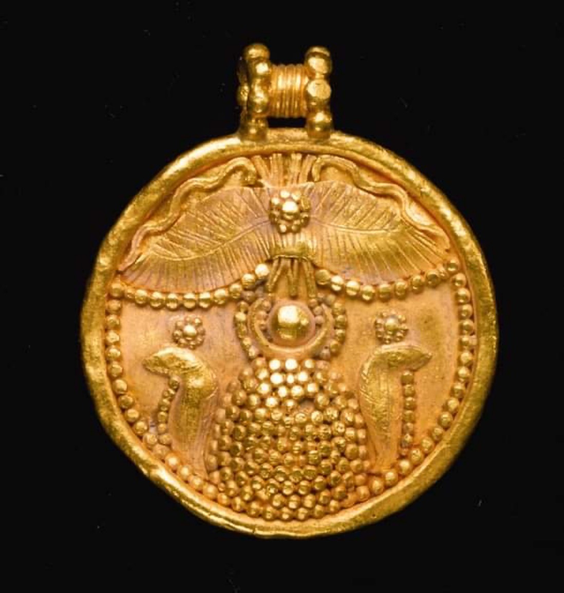 “Carthaginian Gold Pendant (7th-6th Century BC) This disk pendant is composed of two pressed sheets and decorated in front in repoussé, applied elements, and granulation with two uraei flanking a domed element surmounted by a horned sun-disk. Upon that