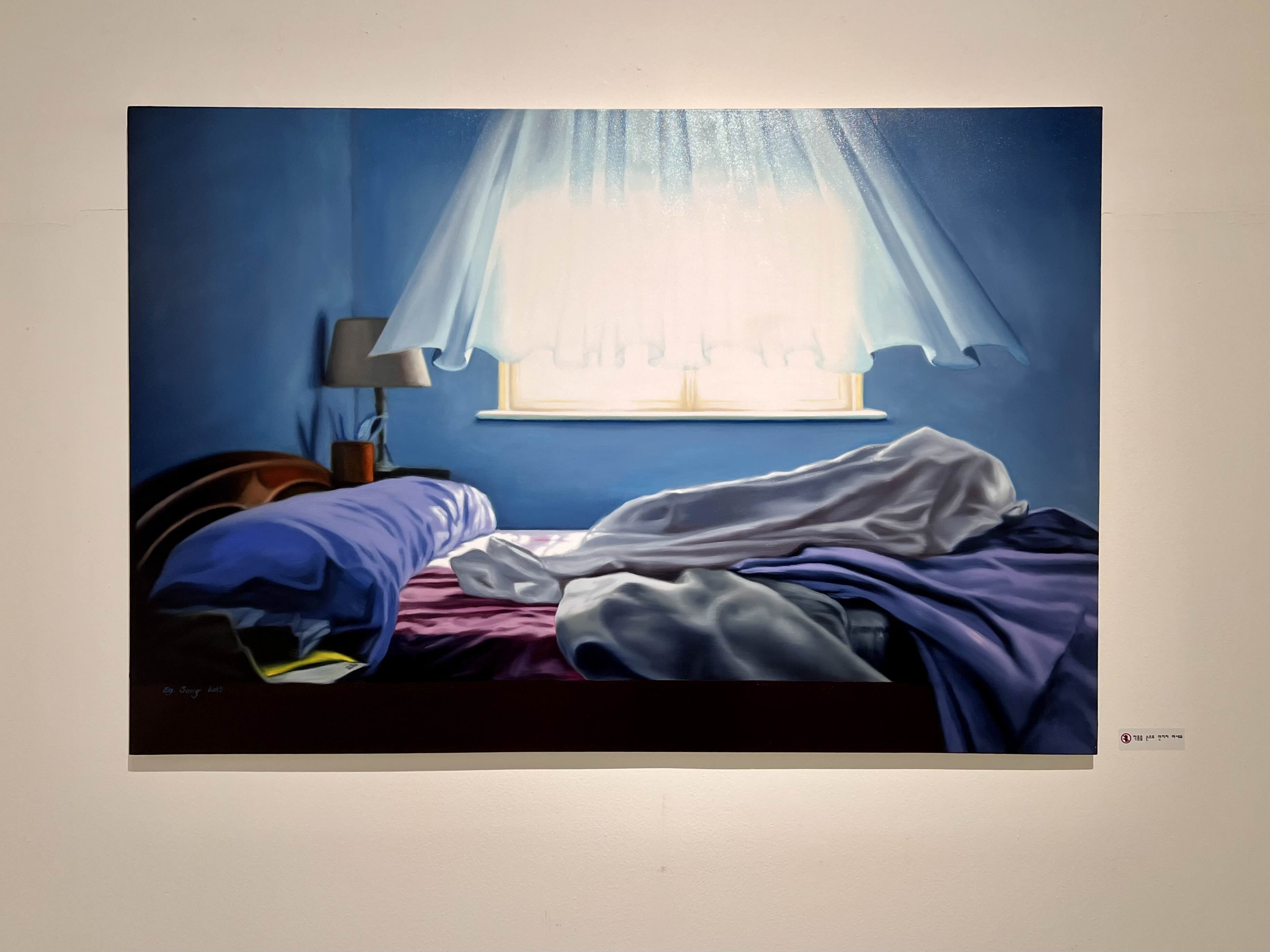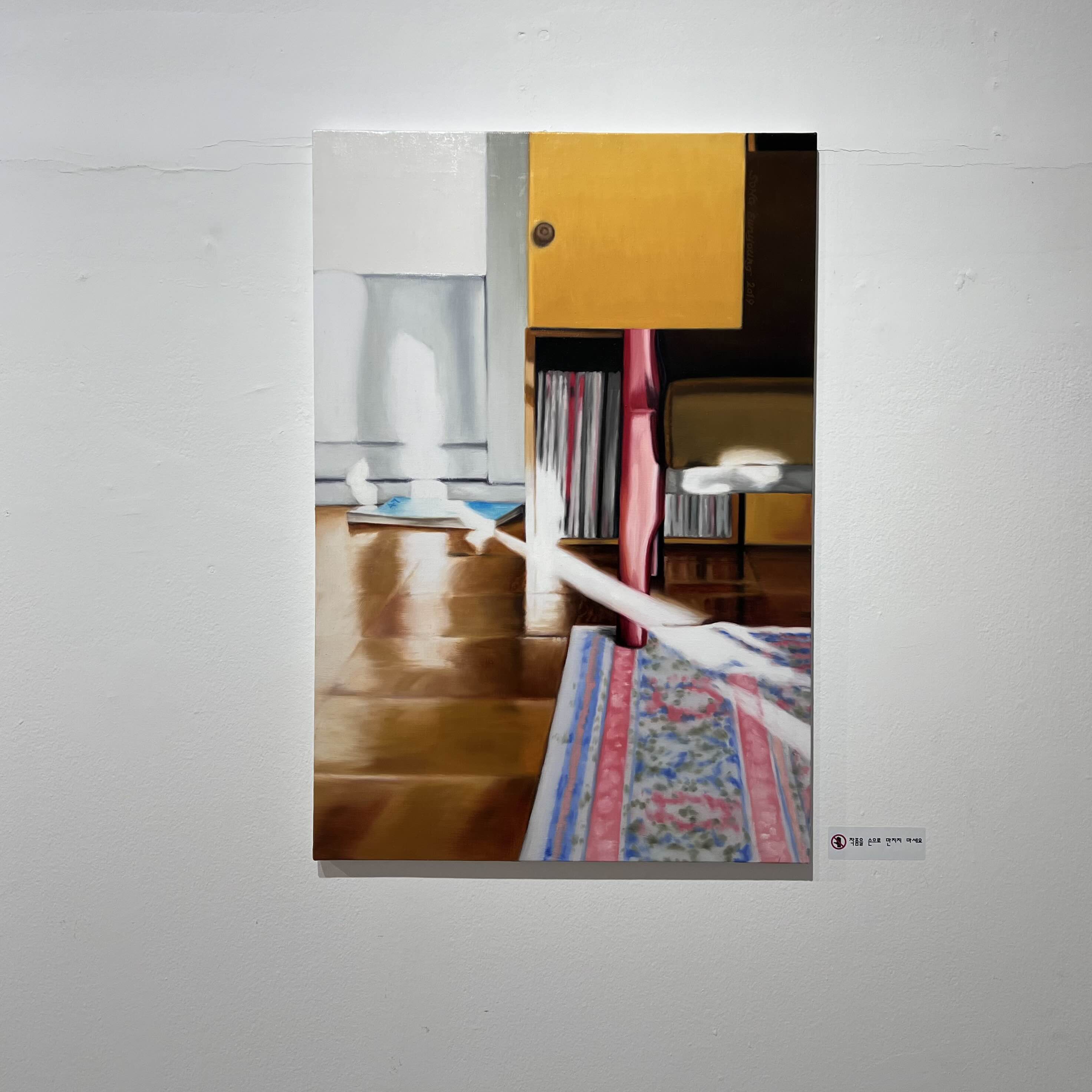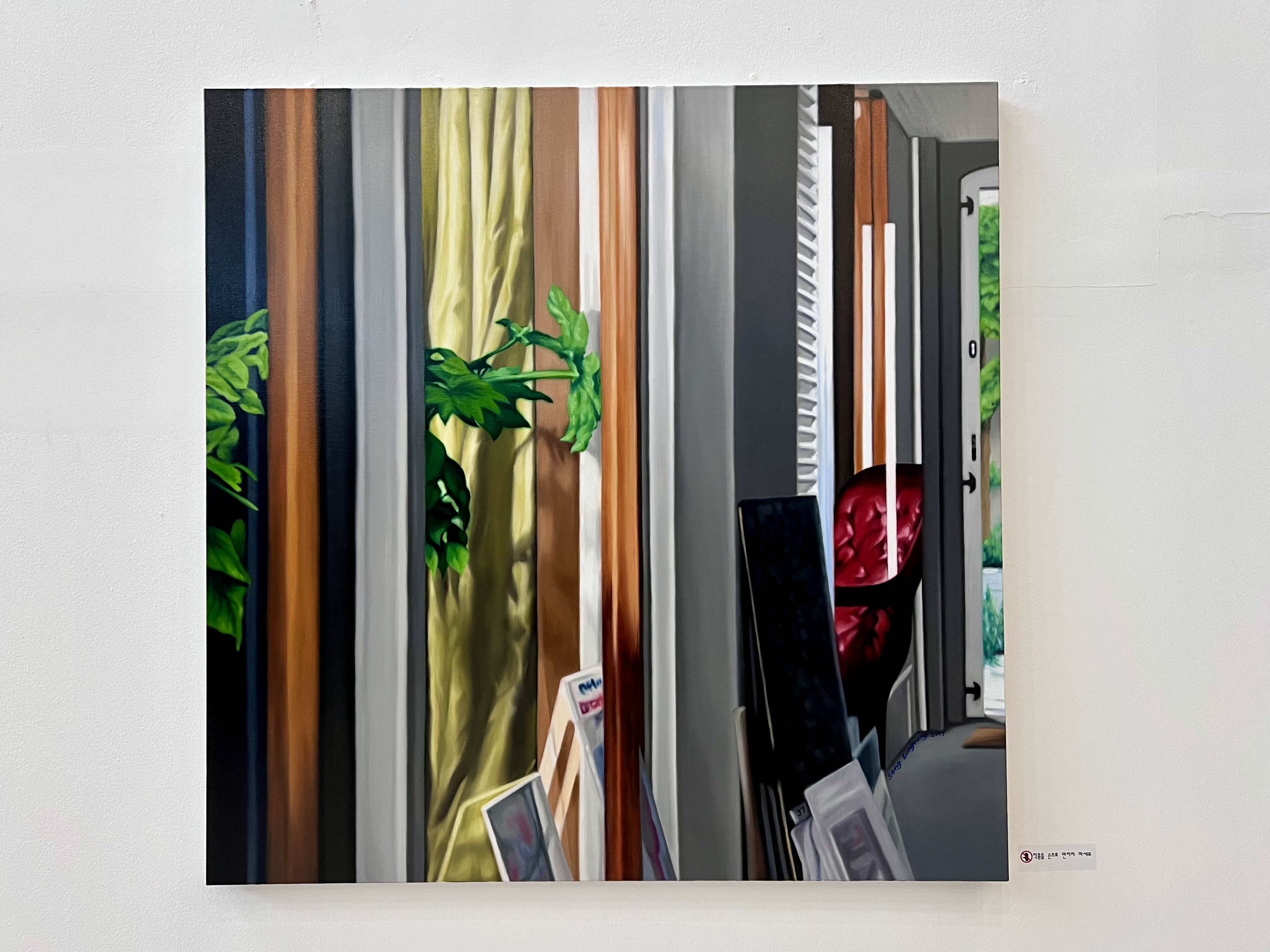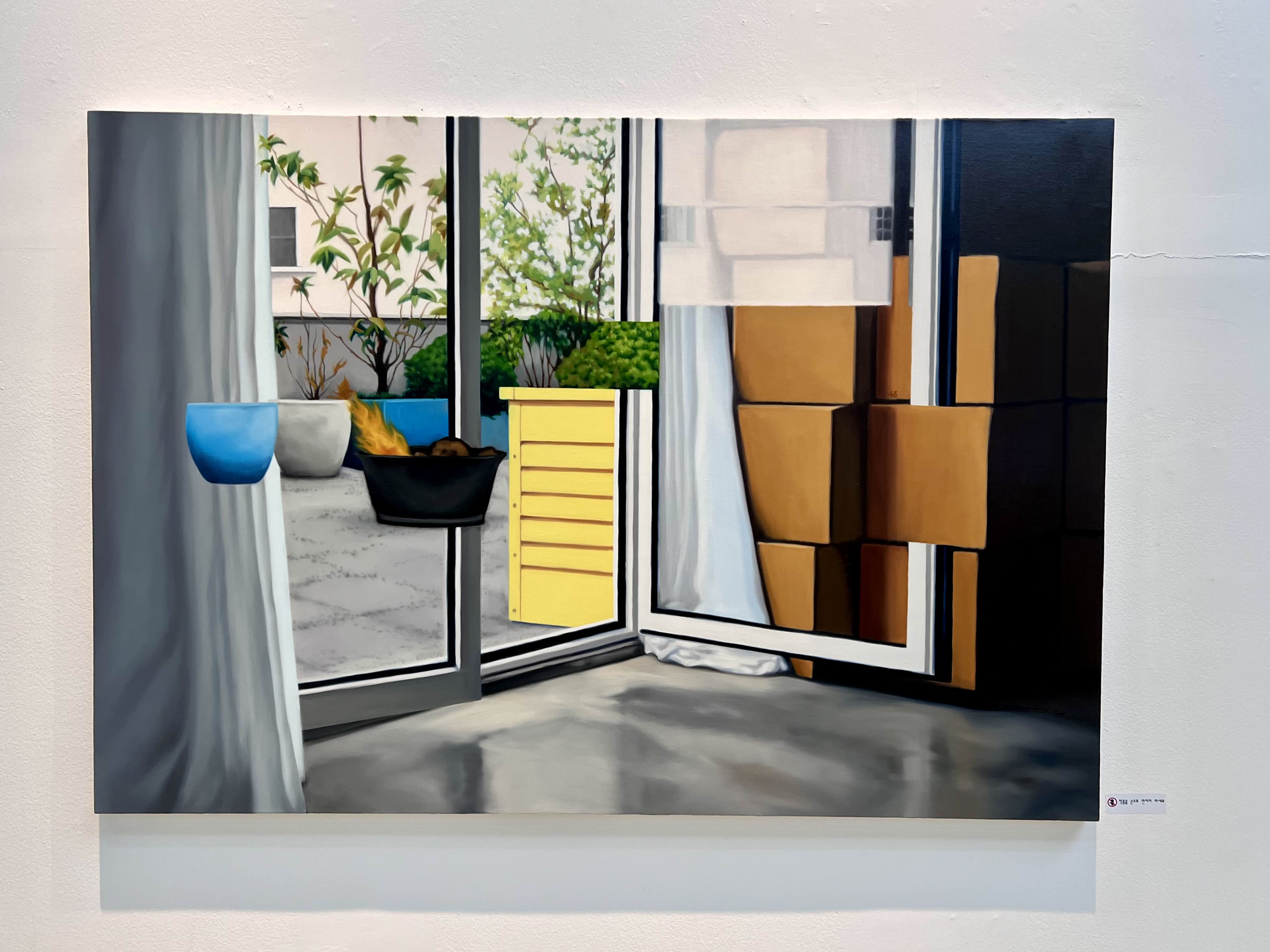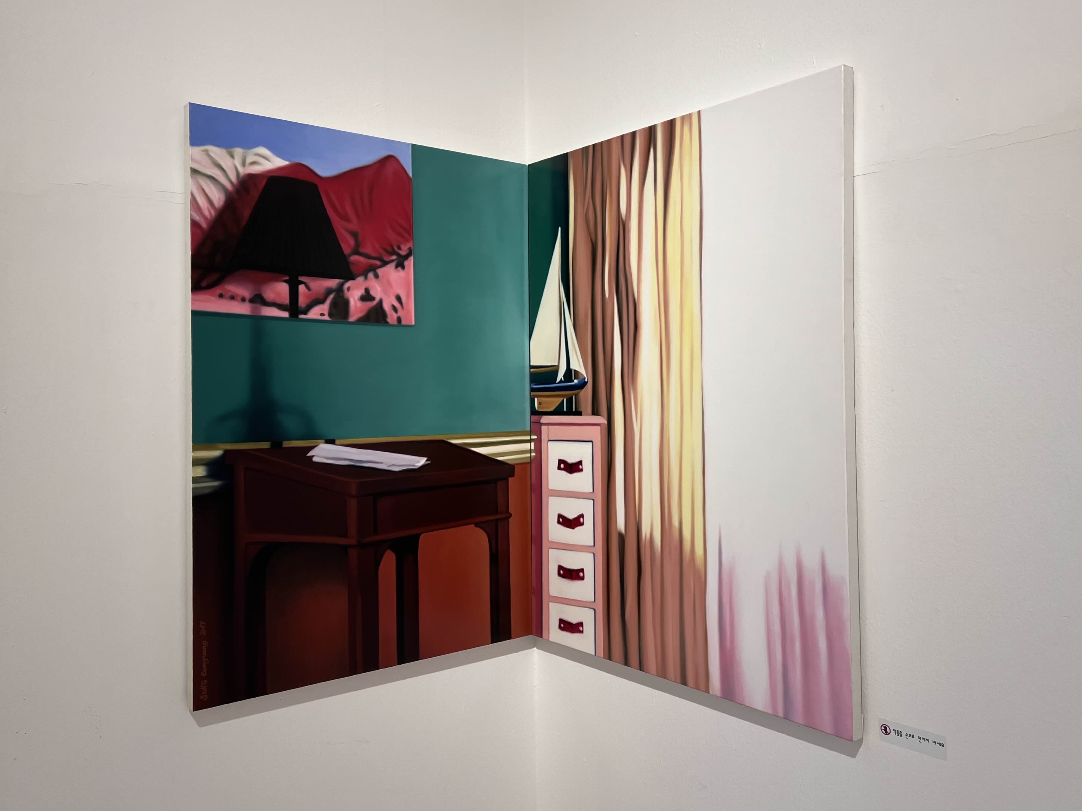 어느 날 불현듯 '나의 그림 안에는 서로 다른 것들이 동시에 기어코 함께 있다'는 말이 되뇌어졌고, 나의 상념은 메를로 퐁티가 언급한 '동시성'으로 이어졌다. 돌이켜보면 나의 지난 작업은 '실재와 환영의 혼재라는 개념으로 설명할 수 있을 것이다. 「침범하는, 연작에서는 장면과 풍경이 원근법과 같은 보편적인 시지각의 맥락을 깨고 환영으로 바뀌는 것을 사실적인 방식으로 제시했다. 작품 속 풍경은 사물과 공간의 경계에 의해서 부분적으로 단절되고, 이 지점에서 가려져 있는 후경의 사물과 공간이 전경의 영역을 침범하기 시작한다. 이 비현실적 어긋남은 덮여 있거나 가려져서 소외된 사물을 드러내며 사실적인 이미지와 수수께끼처럼 뒤섞인다.