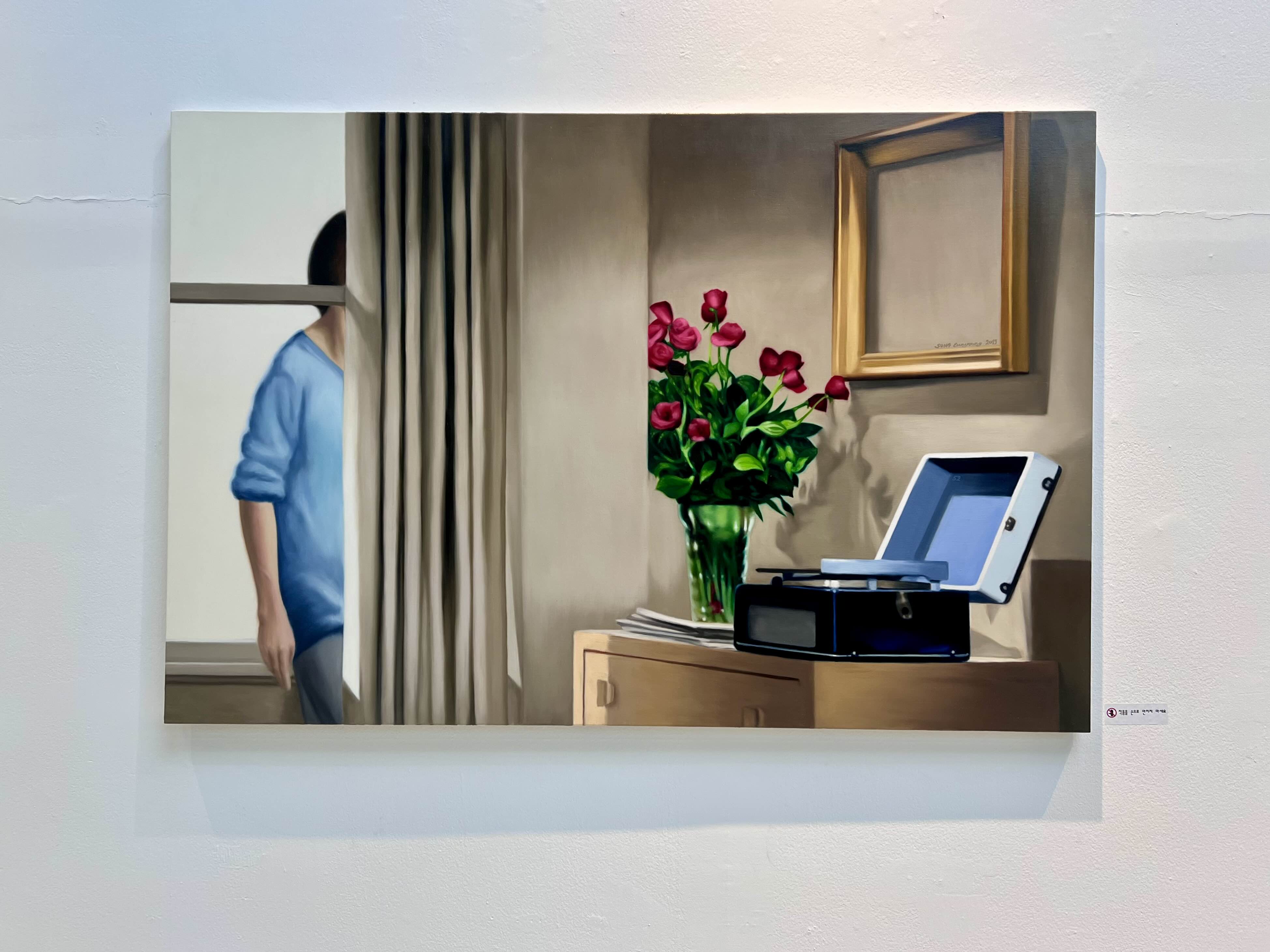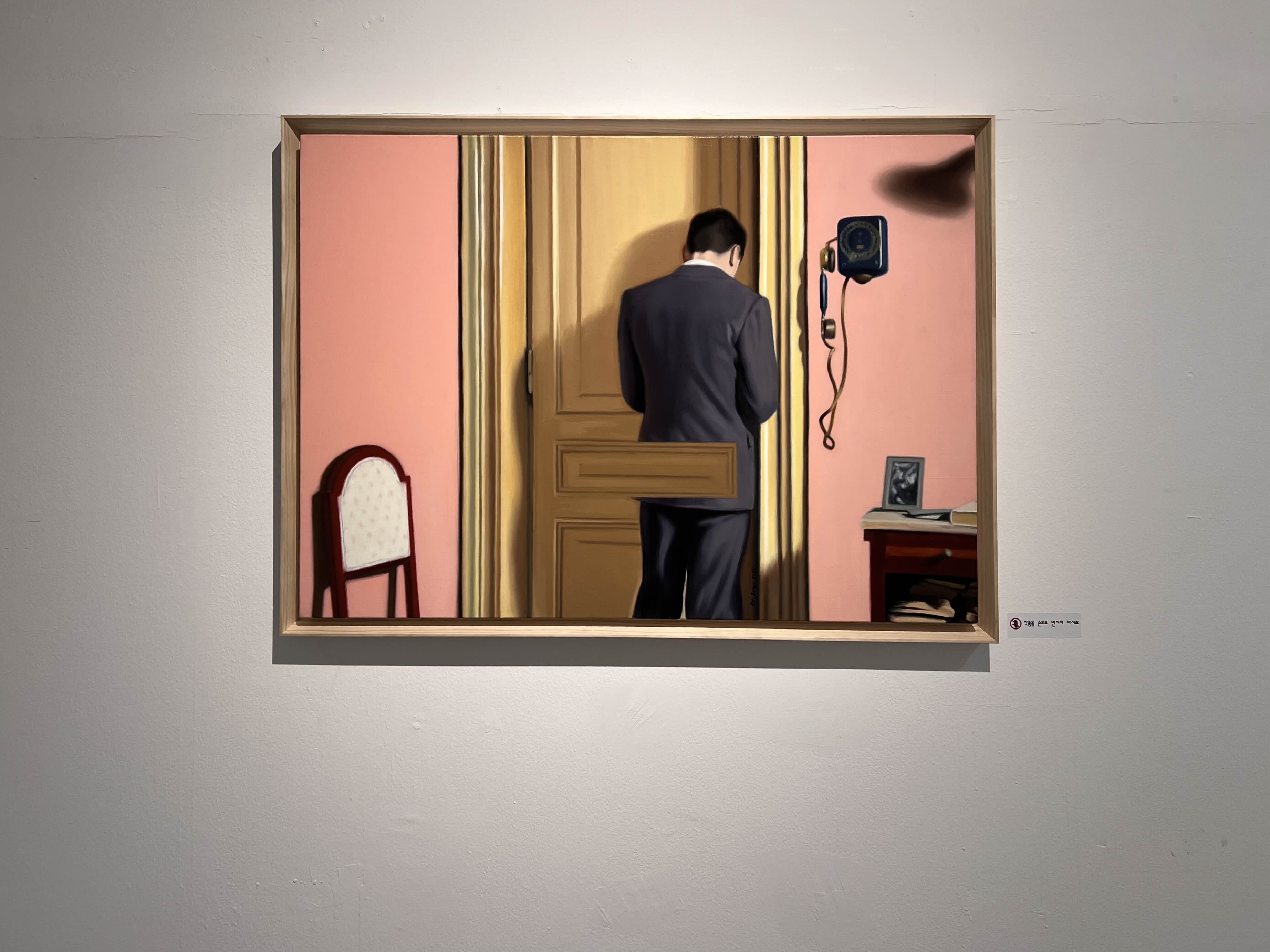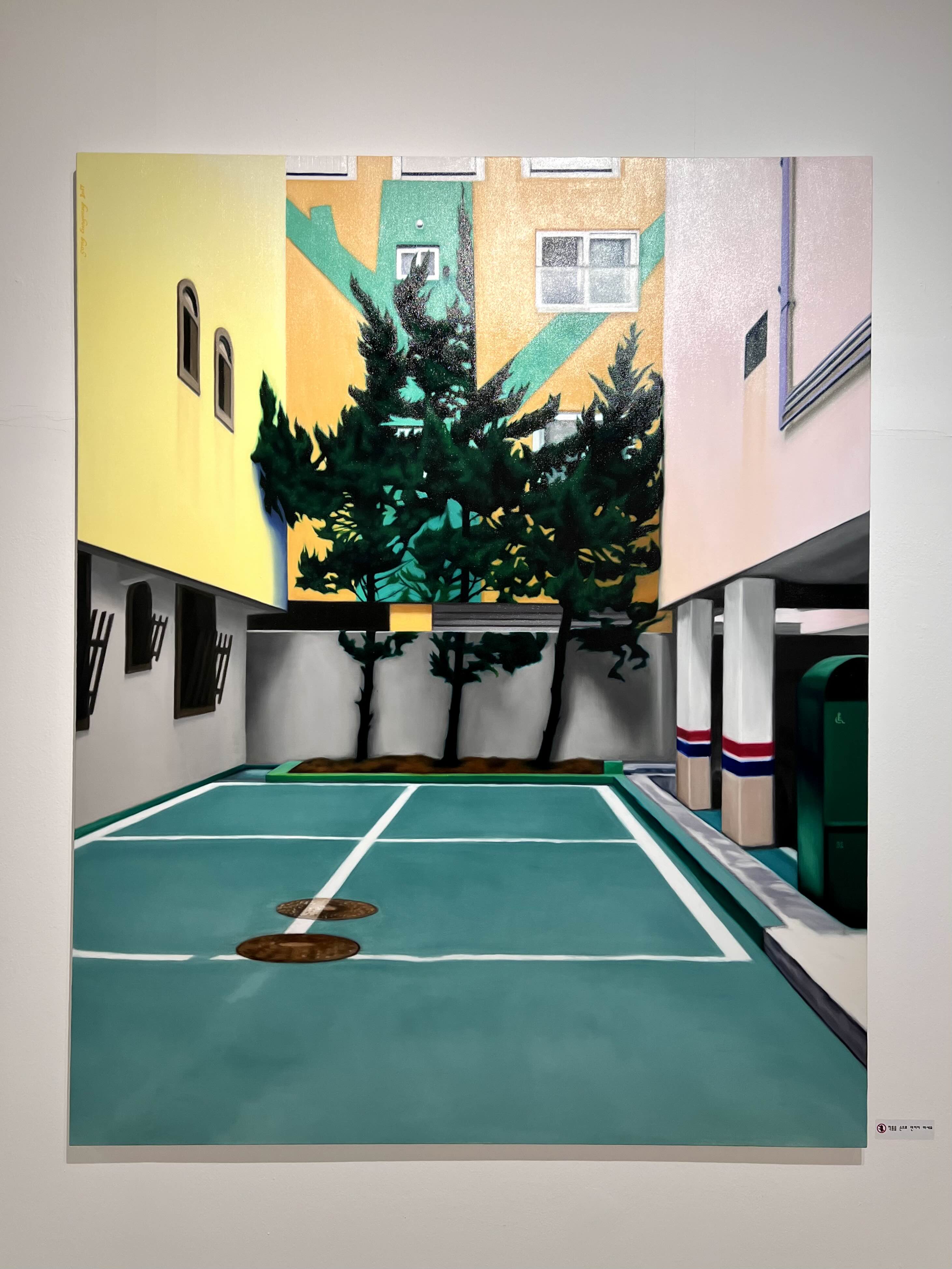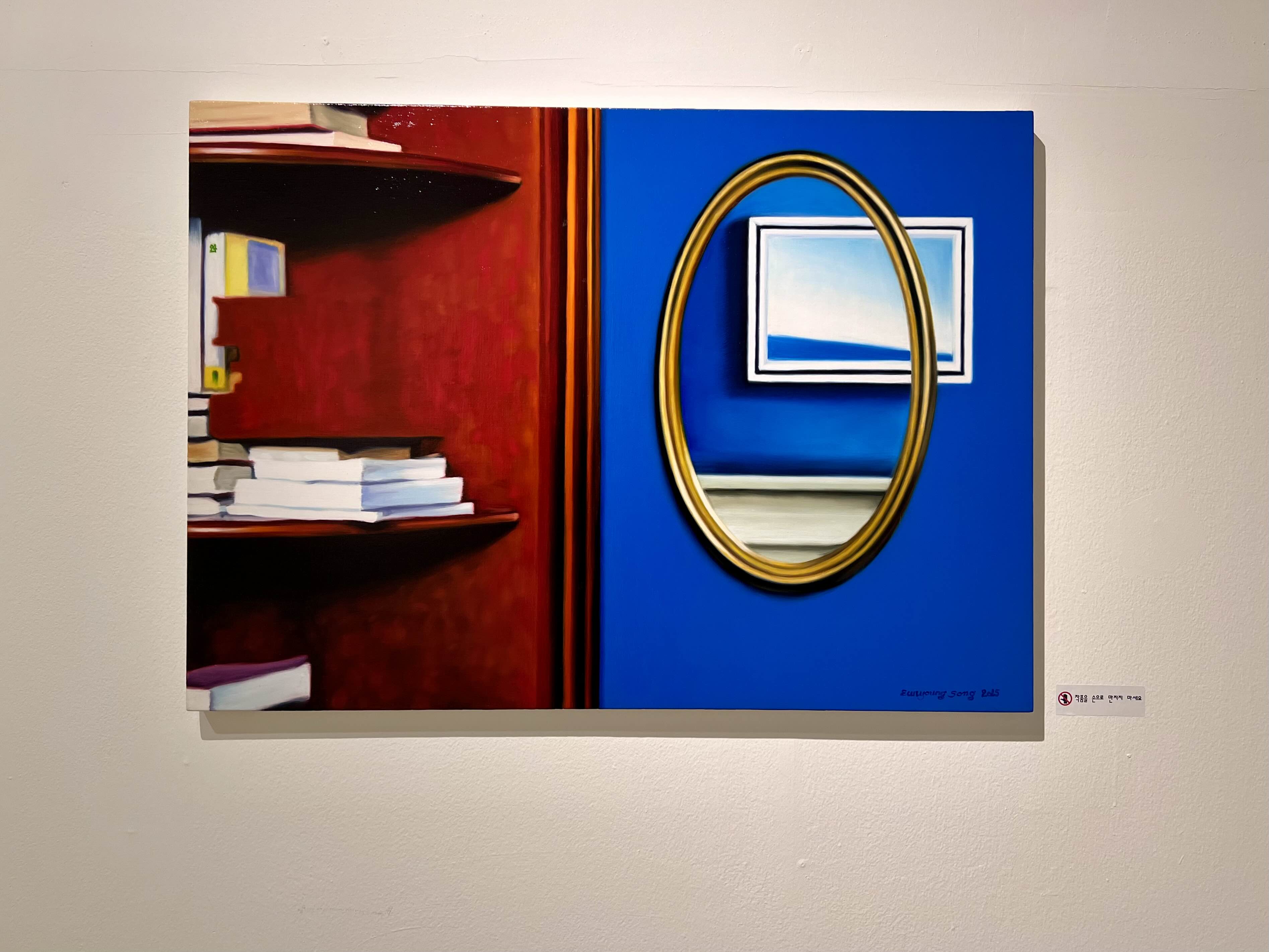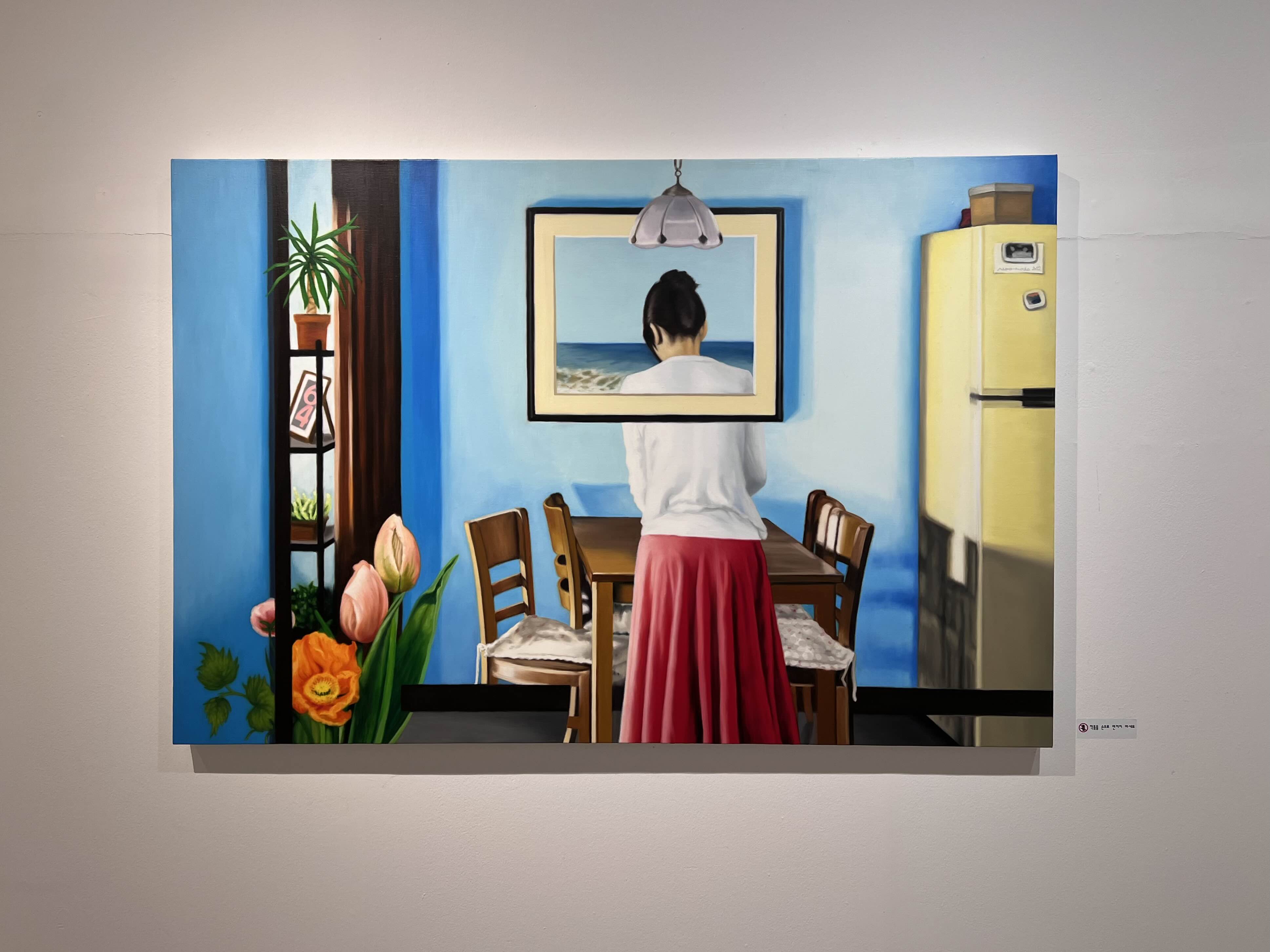 어느 날 불현듯 '나의 그림 안에는 서로 다른 것들이 동시에 기어코 함께 있다'는 말이 되뇌어졌고, 나의 상념은 메를로 퐁티가 언급한 '동시성'으로 이어졌다. 돌이켜보면 나의 지난 작업은 '실재와 환영의 혼재라는 개념으로 설명할 수 있을 것이다. 「침범하는, 연작에서는 장면과 풍경이 원근법과 같은 보편적인 시지각의 맥락을 깨고 환영으로 바뀌는 것을 사실적인 방식으로 제시했다. 작품 속 풍경은 사물과 공간의 경계에 의해서 부분적으로 단절되고, 이 지점에서 가려져 있는 후경의 사물과 공간이 전경의 영역을 침범하기 시작한다. 이 비현실적 어긋남은 덮여 있거나 가려져서 소외된 사물을 드러내며 사실적인 이미지와 수수께끼처럼 뒤섞인다.