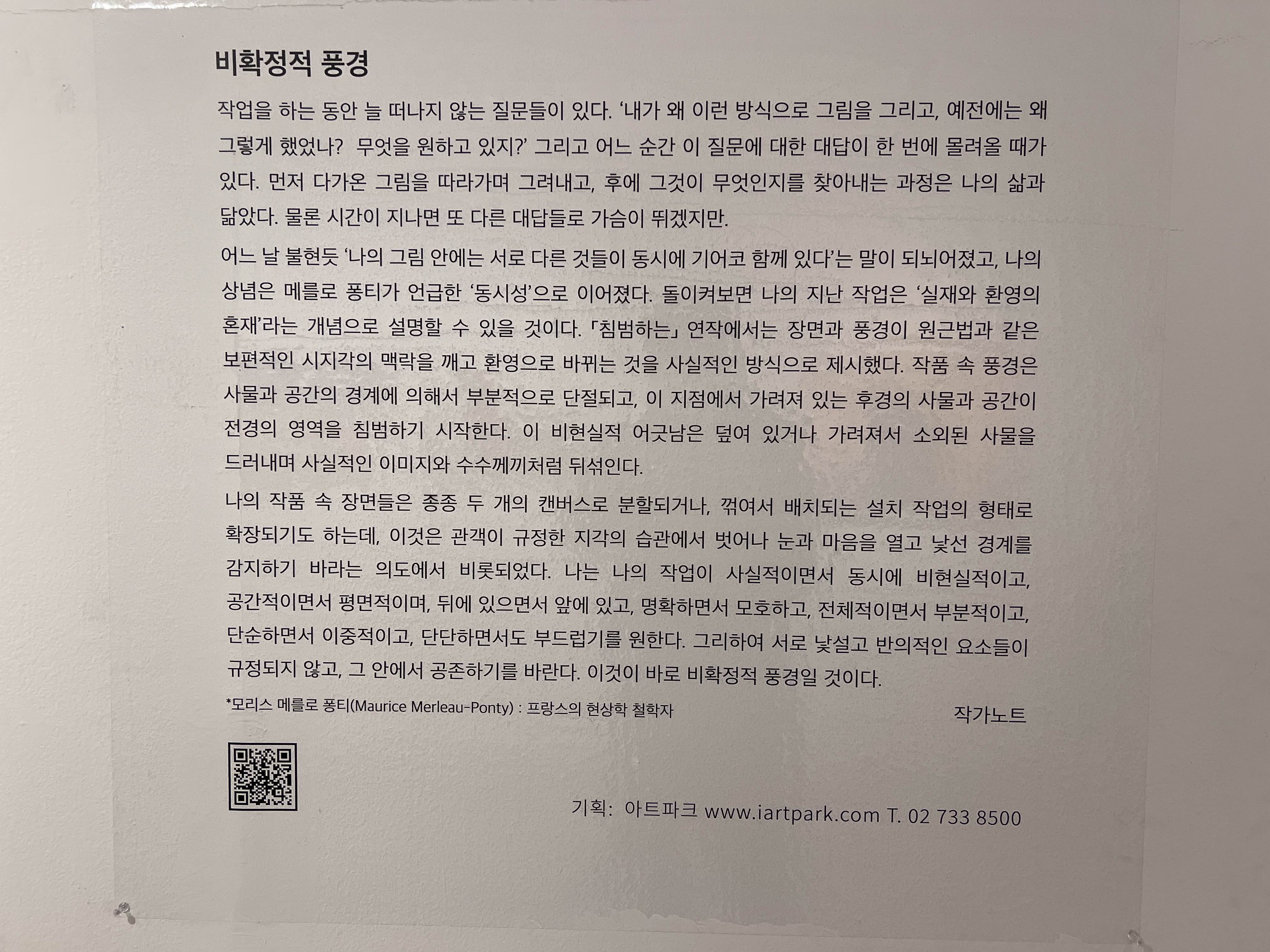 나의 작품 속 장면들은 종종 두 개의 캔버스로 분할되거나, 꺾여서 배치되는 설치 작업의 형태로 확장되기도 하는데, 이것은 관객이 규정한 지각의 습관에서 벗어나 눈과 마음을 열고 낯선 경계를 감지하기 바라는 의도에서 비롯되었다. 나는 나의 작업이 사실적이면서 동시에 비현실적이고, 공간적이면서 평면적이며, 뒤에 있으면서 앞에 있고, 명확하면서 모호하고, 전체적이면서 부분적이고, 단순하면서 이중적이고, 단단하면서도 부드럽기를 원한다. 그리하여 서로 낯설고 반의적인 요소들이 규정되지 않고, 그 안에서 공존하기를 바란다. 이것이 바로 비확정적 풍경일 것이다.