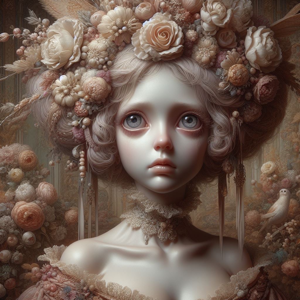 유령처럼 하얀 피부를 가진 여성, 슬픔을 표현하는 유화, 크고 밝고 완벽한 눈, 수많은 꽃으로 장식된 머리, 로코코 스타일의 상세한 의상 착용, 향수를 불러일으키는 분위기, 빈티지, 앤티크, 가브리엘 파체코의 부드럽고 몽환적인 초현실주의를 연상시키는, 추상적 배경, 복잡한 세부 사항, 옥탄 렌더링 기술을 에뮬레이션하는 3D 렌더로 실행됨, Monique Moro 제작, 32k의 매우 선명하고 사실적인 고화질,