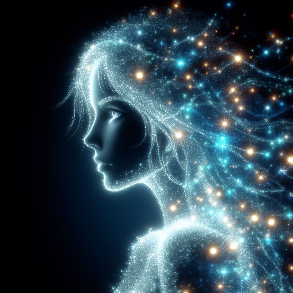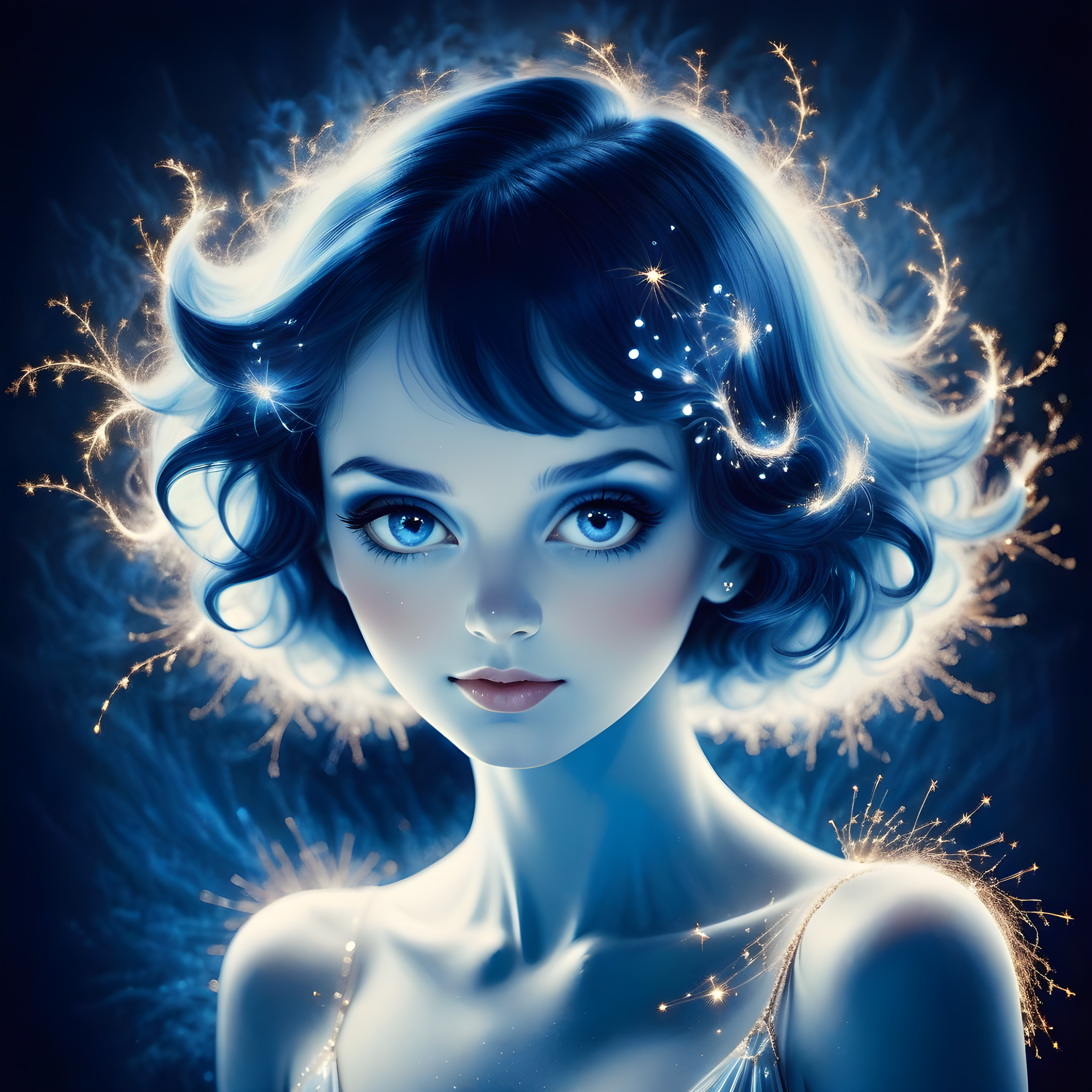 A crystallised silhouette of a beautiful woman made out of sparks of light, bioluminescent glow, white and blue colors only, charming, cinematic, Coby Whitmore, Man Ray, Christian Dior, Jean Marc Nattier, Edmund Dulac, large eyes, perfect face, delicate, slight smile, complex background, shoulder long blue hair,