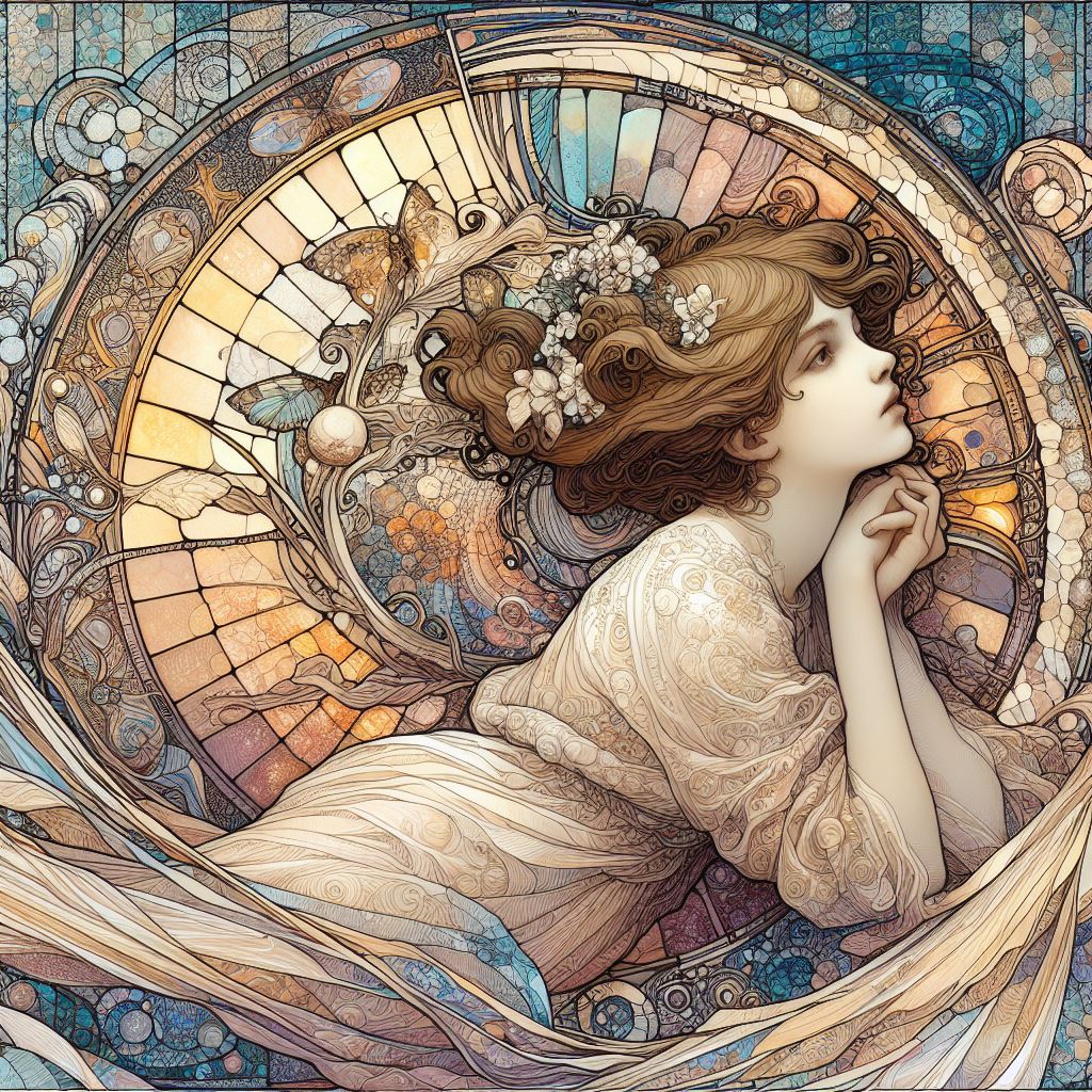 art nouveau, young girl, alphonse Mucha, digital, david mack and joe quesada, oil and ink, flesh griffiths and agnes cecile, byzantine colors in conflict, think freely, descend in a curve, age, cool, impressive, hypecore, faint,