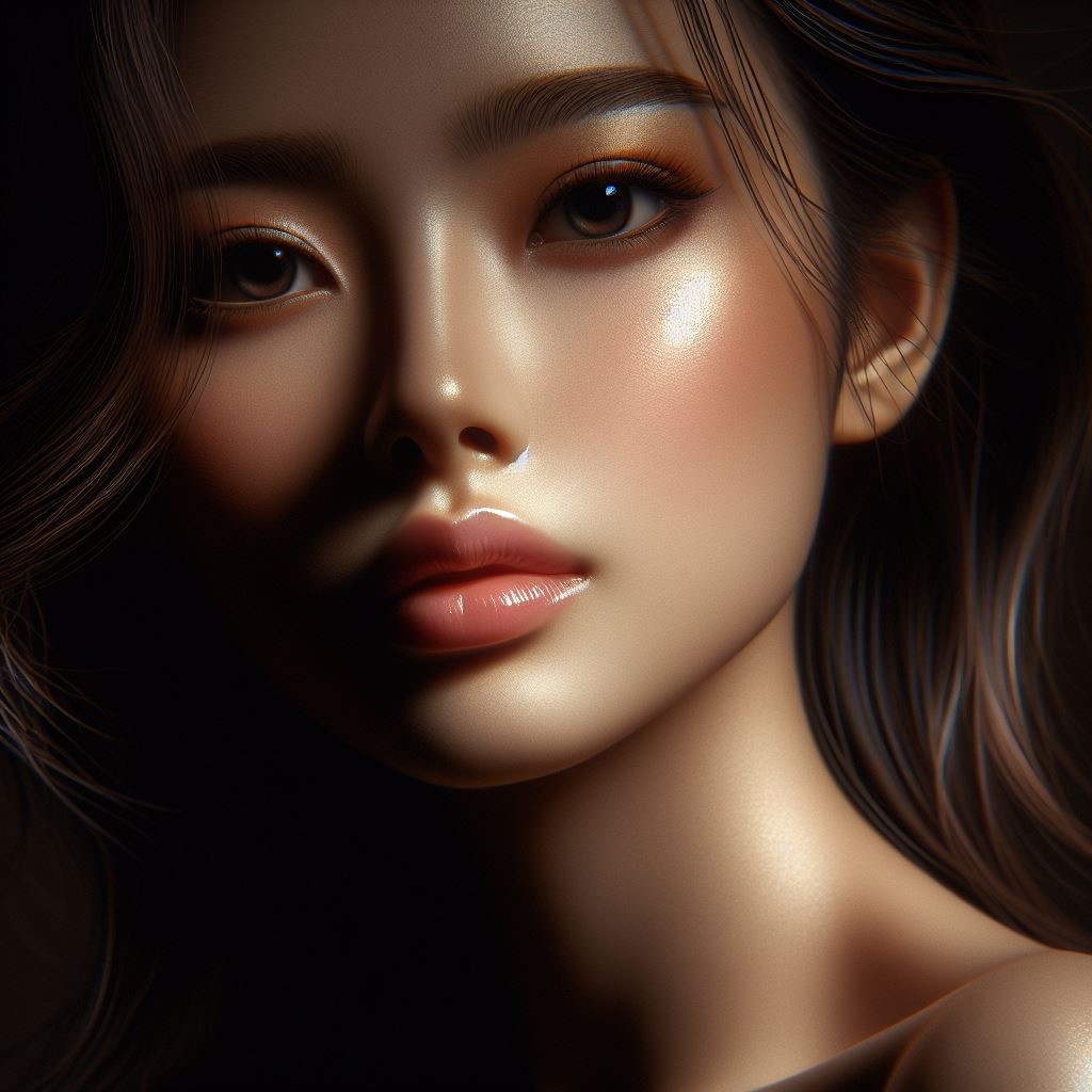 Portrait of a girl with airbrushed perfection capturing her entire form in sharp focus, chiaroscuro lighting playing across her features, exuding beauty in a highly detailed and realistic style, digital painting.