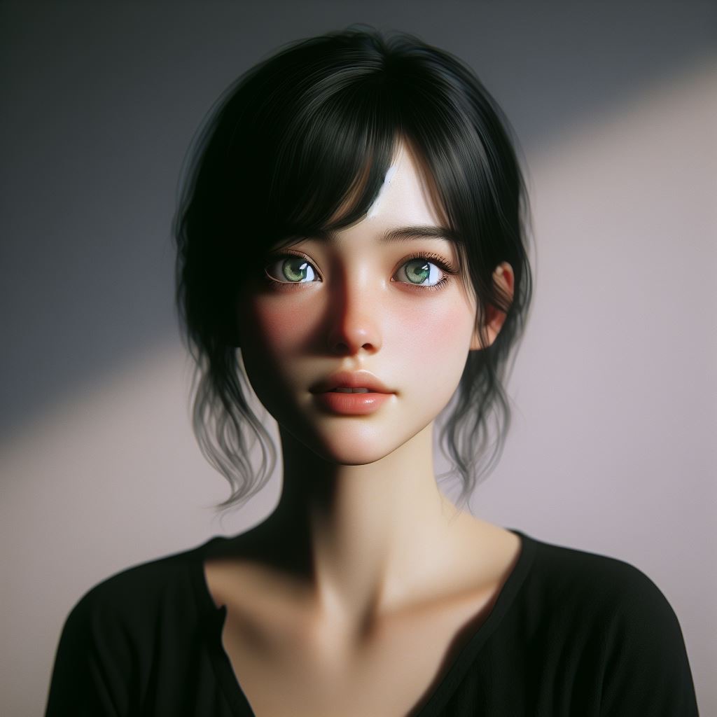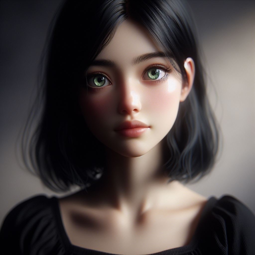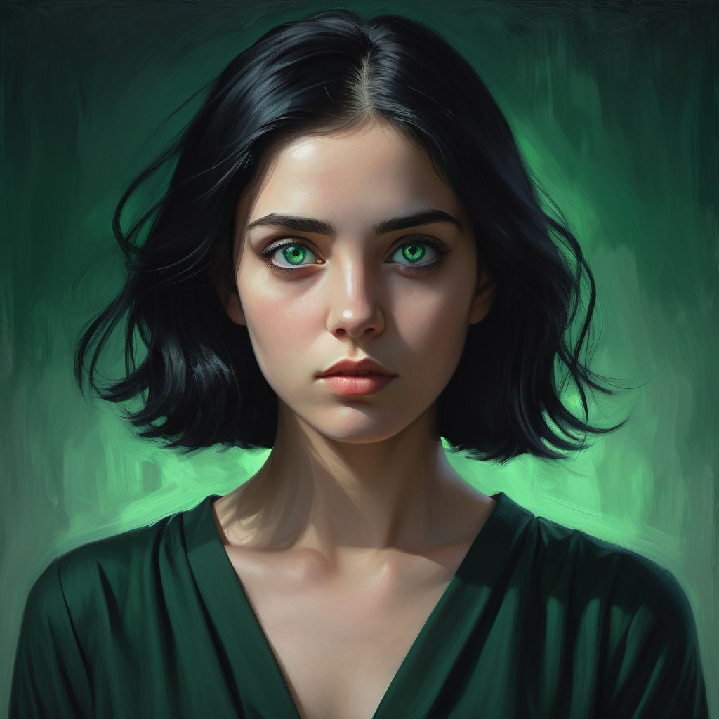 Young woman with black hair, eyes an emerald green, casting an innocent, hopeful gaze, dressed in simple black attire, against a minimalist backdrop, focus on expressive eyes and subtle interplay of shadows, capturing the essence of hope, digital painting, ultra fine detail, cinematic lighting.