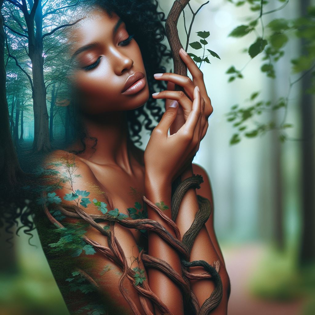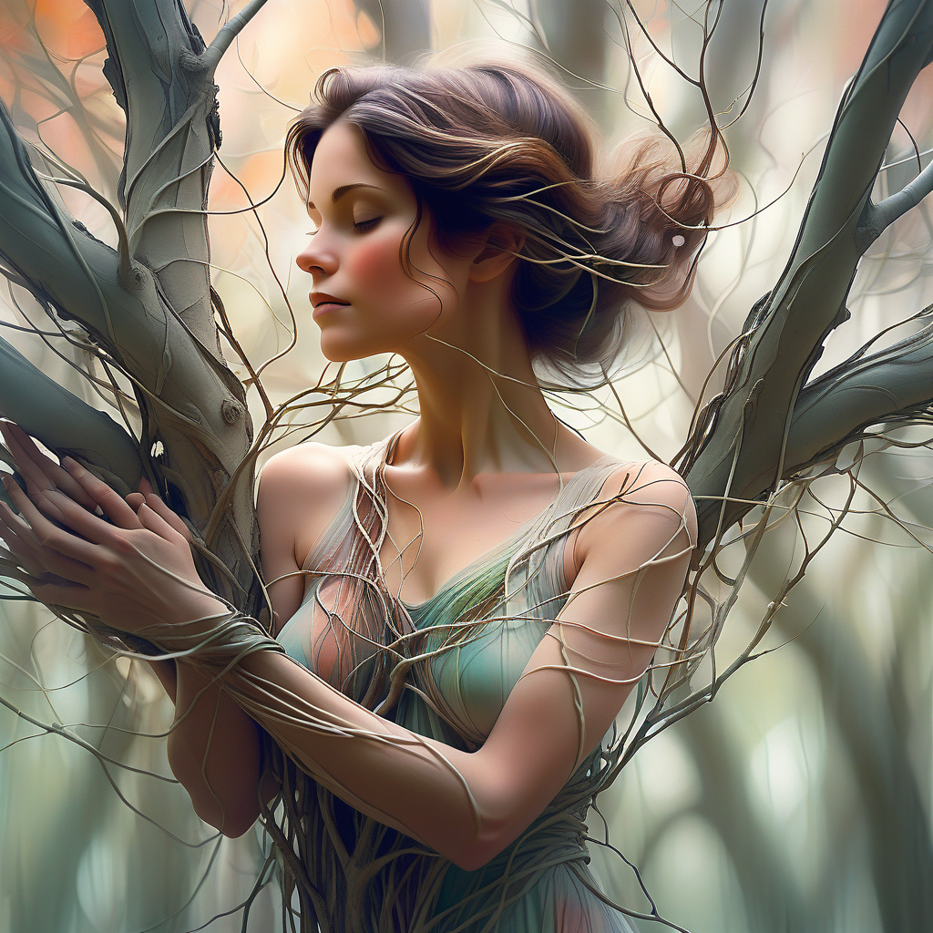 Beautiful woman intertwined with branches of a tree, the form of the woman and the tree seem to be merging showing a deep connection, serene forest scene, serene and soft colors, double exposure, enchanting, highly detailed, intricate details, sharp focus, vibrant colors, high resolution, natural Lighting, Perfect Composition, Harrison Fisher, high resolution