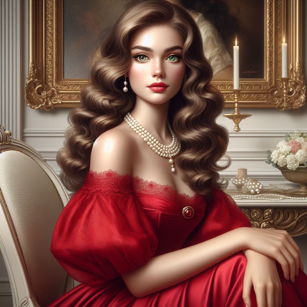 olio style portrait, of an elegant woman, full body, she has an elegant red dress, a pearl necklace, she has green eyes, wavy hair, she belongs to high society, she is sitting on a chair, the egante, an olio style painting, has a red dress, green eyes, elegant background hyper realistic, super detailed, 8k, 3d photorealistic,style, belongs to high society, physical features of eleoant woman, hyper realistic, super detailed, 8k, 3d photorealistic, realg