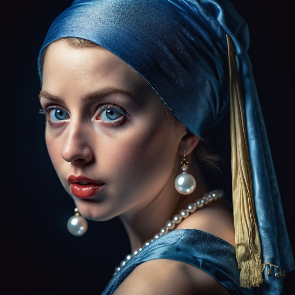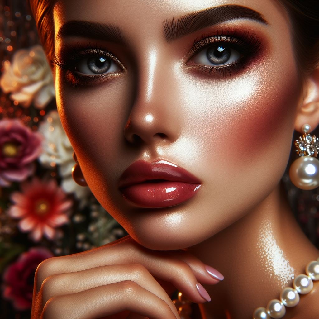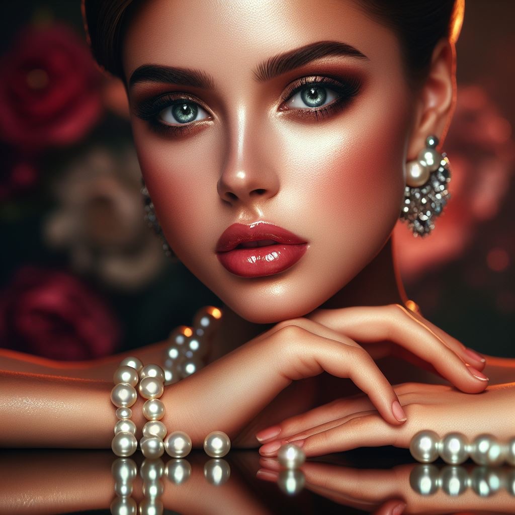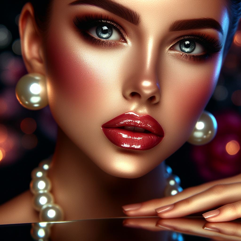 Close-up portrait of a pin-up girl with pearl earrings, glossy texture, direct eye gaze, complex pose, balanced composition with equal margins, well-groomed and elegant, very sharp clarity, beauty, sophisticated charm, night setting Her perfect face Picture a subtle mood painting with soft, subtle tones casting light on, a direct look towards a reflective surface, a multi-hued floral background that emphasizes the rich colors and vivid textures of the scene, and splashes of water.