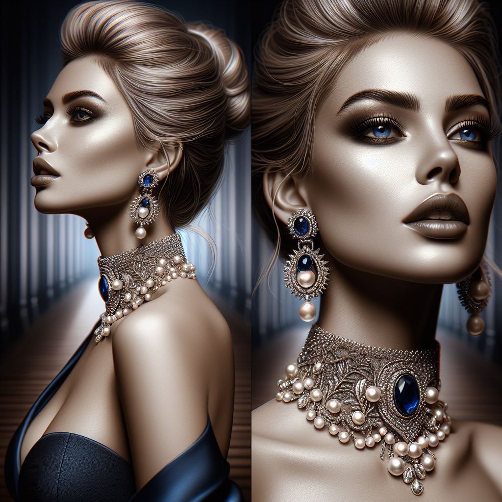 (masterpiece), (best quality:1.2), complex details, (high detail:1.2), earrings made of round sapphires with pearls, a top model with perfect makeup on the catwalk (focus on the body:1.1), (portrait, solo, full-length), detailed background, detailed face, detailed body.