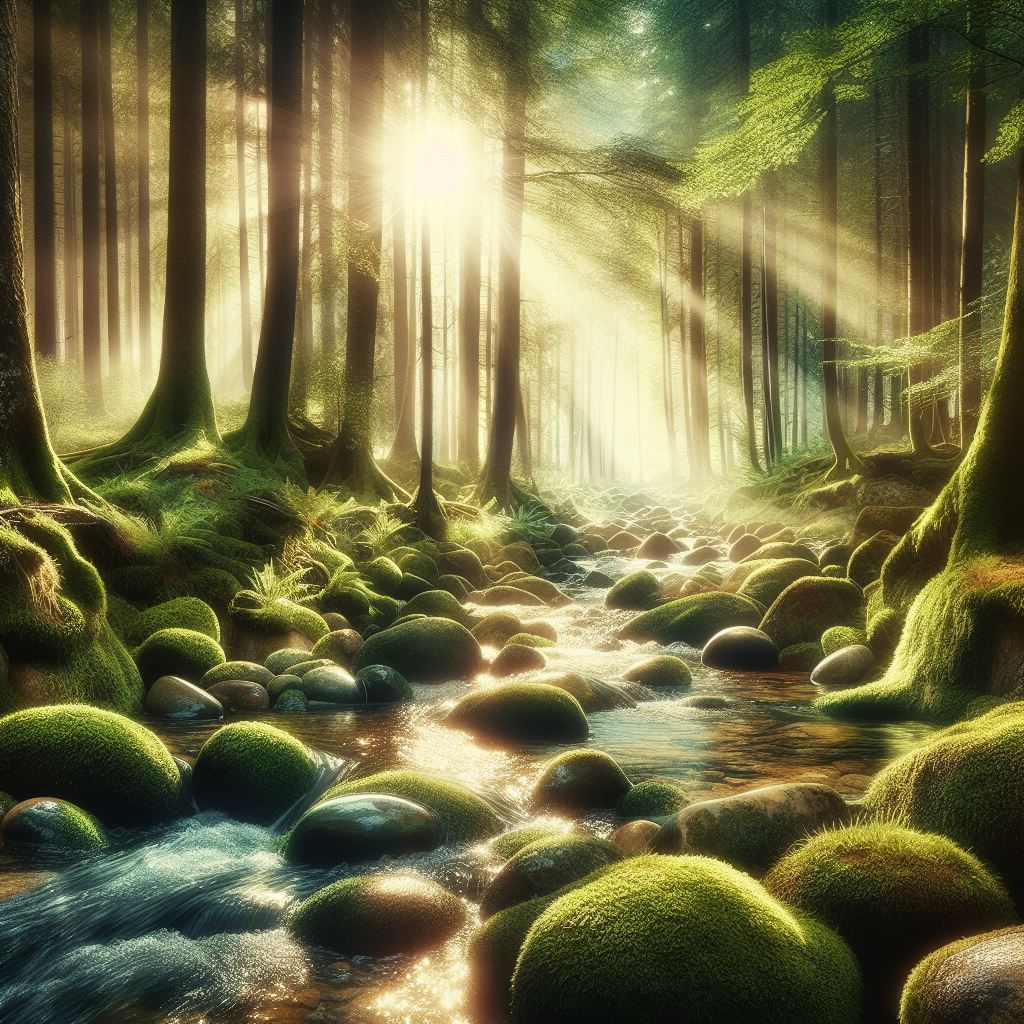Stunningly beautiful forest scene, by McKay, magical, peaceful, zen, serene, glimmering stream, whimsical backdrop and scenery, mossy rocks, smooth stones, gorgeous, mixed media, collage, 3D, patched together, eye catching, shimmering, gossamer, ethereal, fantasy, award winning, thought provoking, hyper detailed, highly detailed, beautifully lit, scattered light, streaming sunbeams, hyper detailed, perfect