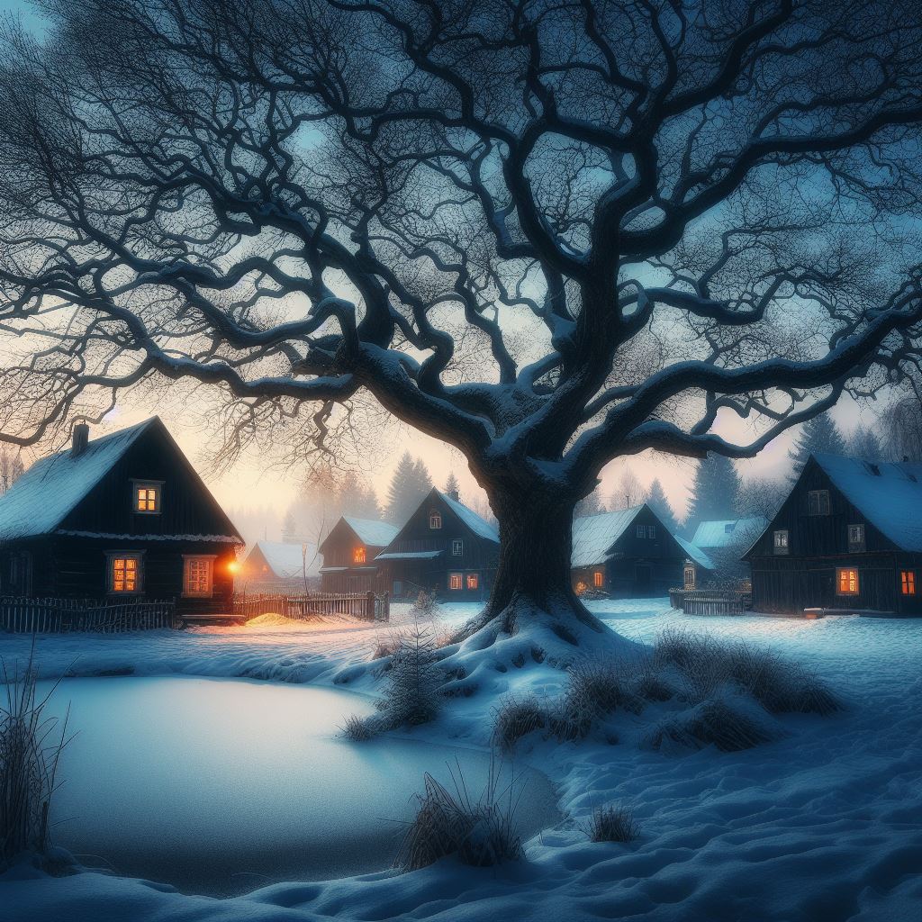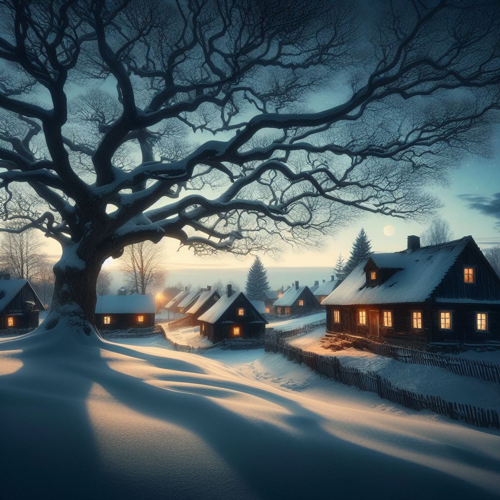 This serene winter scene portrays a quaint village. In the foreground stands a large, gnarled tree with intricate branches, silhouetted against the evening sky. The ground is blanketed in snow, reflecting the soft light from the windows of nearby houses. These rustic dwellings huddle closely together, their muted colors harmonizing with the tranquil atmosphere. The sky, painted in soft blues, suggests either early morning or late evening light, with a single visible moon addi