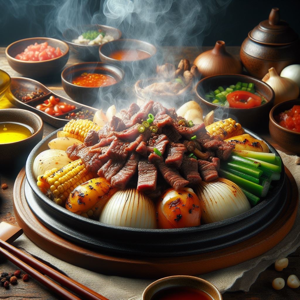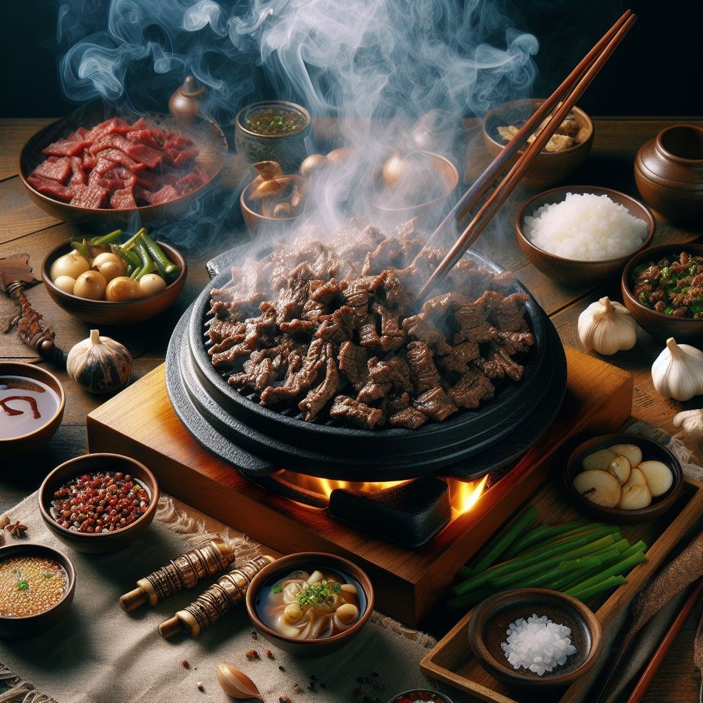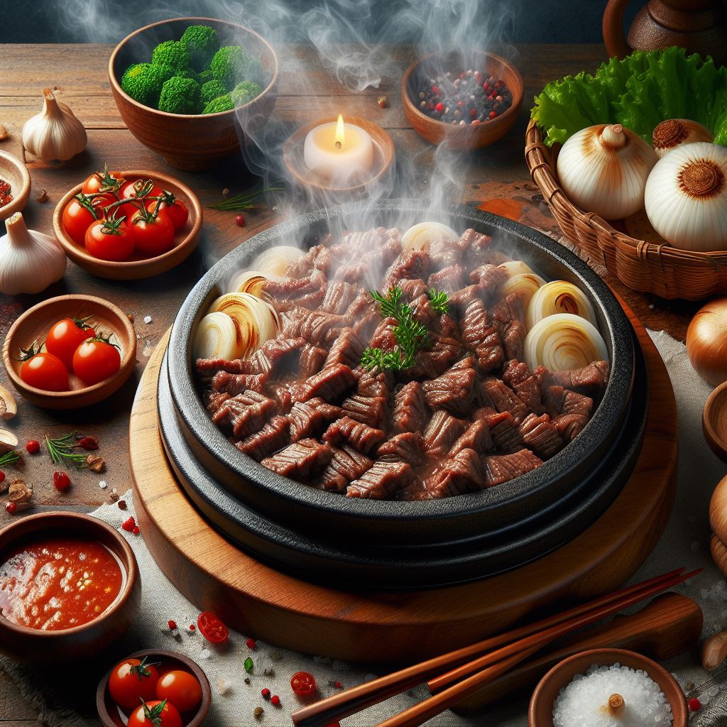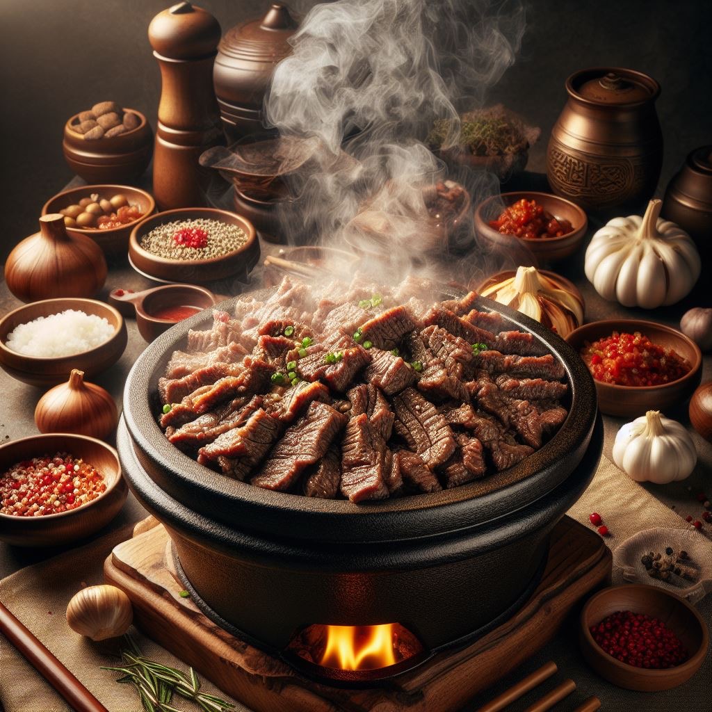Korean traditional food bulgogi, steaming, the smell of cooking beef, mouth-watering food photos, 3D, high definition,