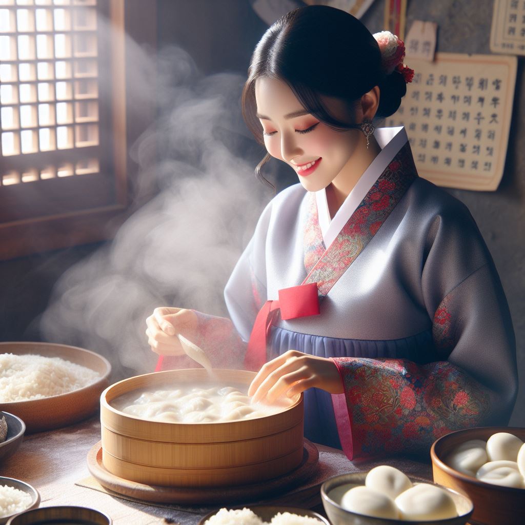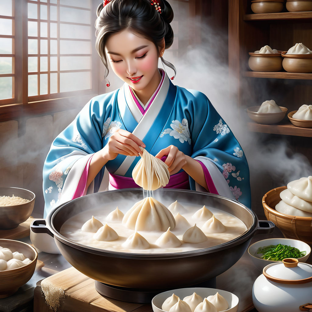 Korean traditional food rice cake and dumpling soup, steaming cooking smell, mouth-watering food photography, 3D, high definition, happy Korean woman in hanbok making dumpling dough, subtle light, low angle professional still photo, surrealism. --style raw --v 6.0 --ar 3:4