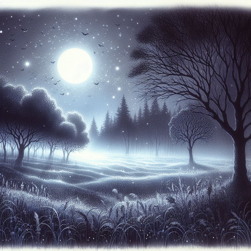 Midnight, a meadow covered in dew and mist, tree silhouettes in the backdrop, by C_F. Moonlight, romantic atmosphere, magic of nature, highly detailed drawing using pen and ink, liquid ink, soft colours, strong interplay of light and shadow.
