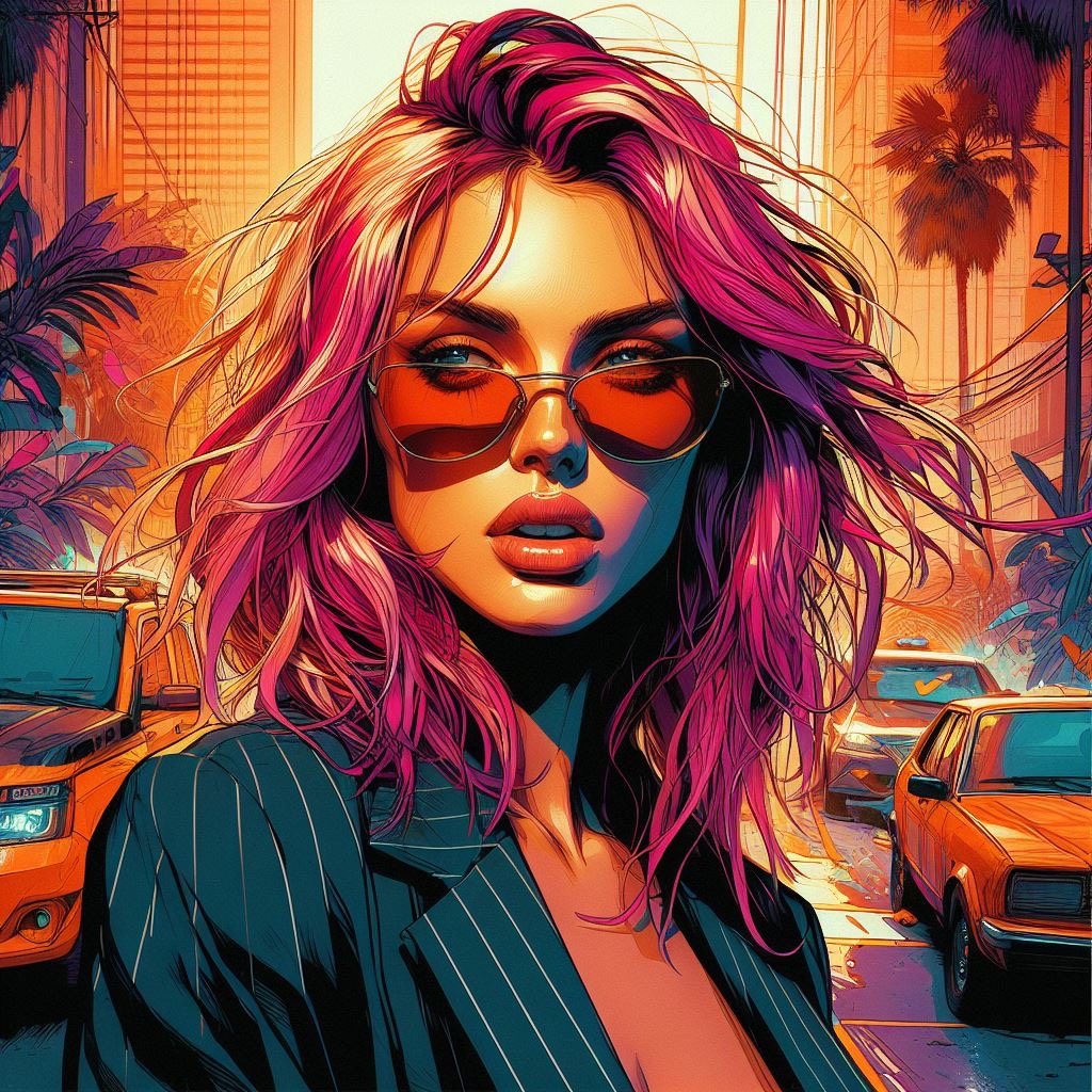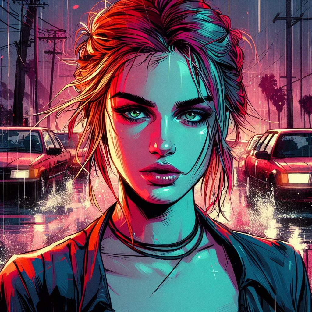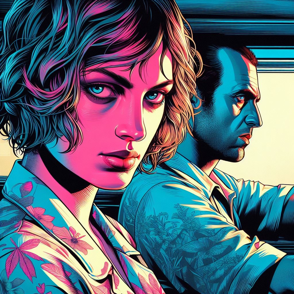 photograph by [Brooke Shaden | Tomer Hanuka] in the style of GTA5-style Illustration Digital Art by Tomer Hanuka, vibrant colors, graphic novel style, dynamic compositions, emotional storytelling, bold lines,